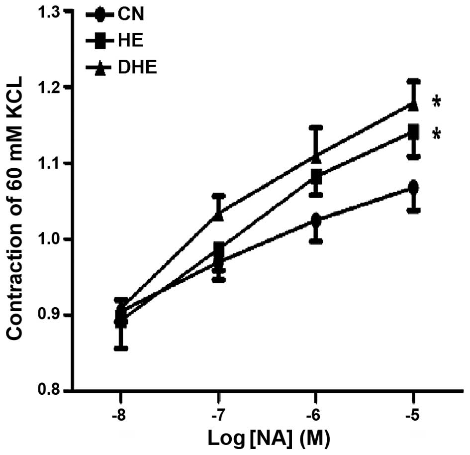 In the CN and HE groups, NA induced a dose-dependent contraction on the aortic ring. However, the contractive response was stronger in the HE compared with the CN group (P<0.05), but there was no significant difference between the HE and DHE groups (P>0.05) (Fig. 3).