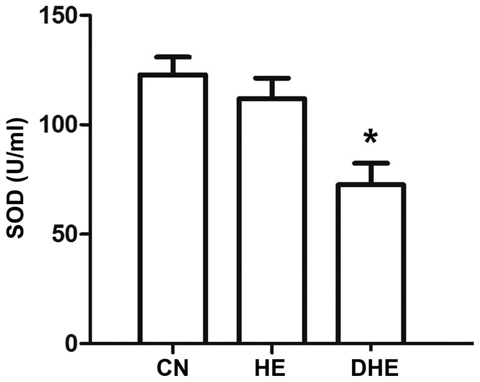 The serum SOD in the DHE group was lower than that of the CN group (P<0.05) (Fig. 4), the level of MDA was significantly higher than that of the CN group (P<0.05) (Fig. 5). Compared with the CN and DHE groups, the serum SOD and MDA in the HE group was fluctuated but no significant difference was observed (P>0.05).