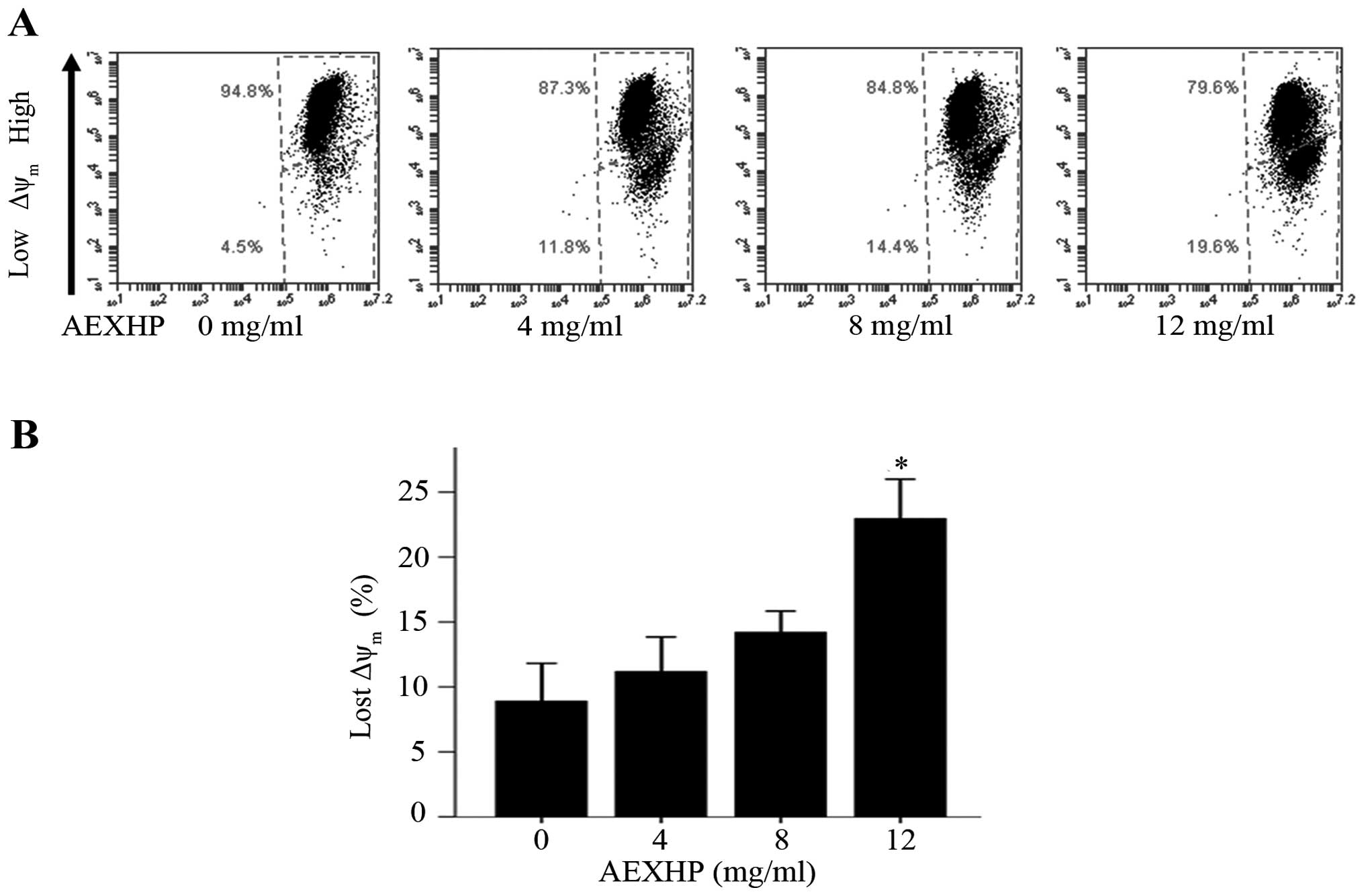 To assess whether the apoptosis of Hs578T cells was associated with the depletion of the Δψm, Hs578T treated with various concentrations of AEXHP were assessed by JC-1 staining and flow cytometric analysis. After treatment with AEXHP (4, 8 and 12 mg/ml) for 24 h, the percentage of cells with Δψm loss increased from 4.5% in the control group to 11.8, 14.4 and 19.6%, respectively, which was significant at the highest concentration (P<0.05) (Fig. 3A and B). Thus, AEXHP induced the depletion of the Δψm in Hs578T cells in a dose-dependent manner.