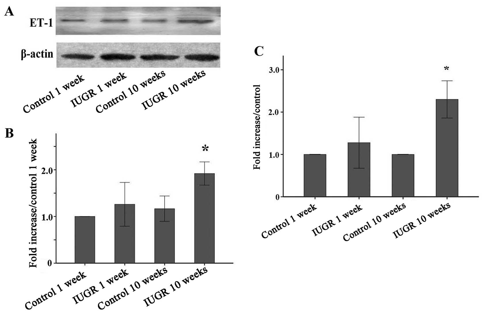 Unlike the higher expression of ET-1 in endothelial cells or lung tissue, ET-1 protein expression in peripheral leukocytes was relatively low (Fig. 1). The ET-1 protein level of leucocytes from the 1-week IUGR group was slightly high compared with that from the 1-week control group. There was no statistically significant difference between the groups (P=0.113). However, ET-1 expression of leucocytes from the 10-week IUGR rats was obviously higher than that of the other groups (P<0.05). A similar trend was also observed in the ET-1 mRNA levels in leucocytes.