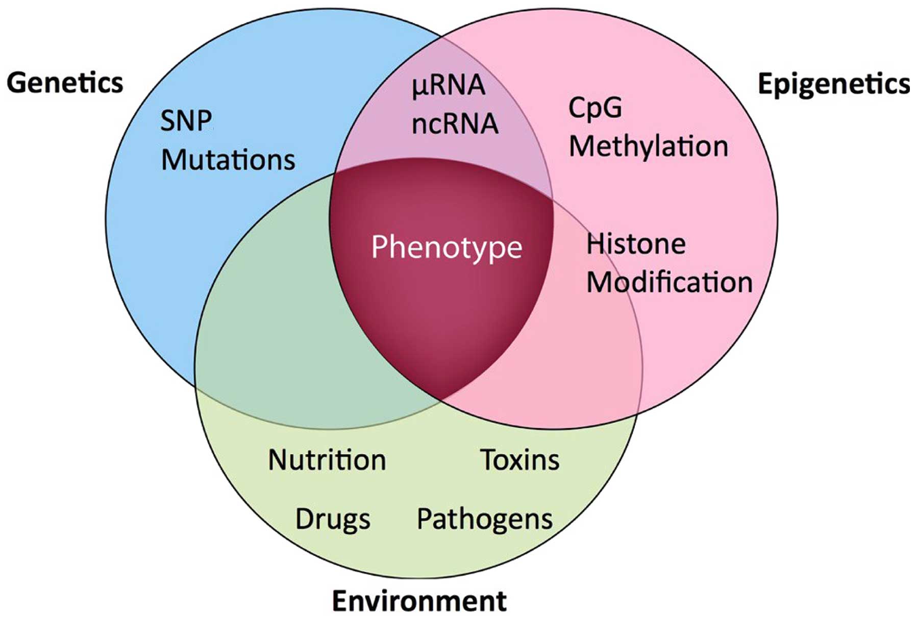 The term ‘epigenetics’ is best understood within the context of the interaction between the gene and the environment (Fig. 1). From a historical perspective, the definition of the term has metamorphosed over the years from its original coinage and meaning by Slack (13). More than 10 years later, another author defined ‘epigenetic systems’ as supportive processes involved in ascertaining the specific genes that will be expressed in any individual cell (14). Following the identification of heritable models of DNA methylation, the hypothesis that epigenetic characteristics were inherited as controlling indicators coupled with the genome predominated. Epigenetics was subsequently defined as the investigation of mitotically and/or meiotically inheritable alterations in gene expression, which are not associated with alterations in DNA sequence (15). The identification of the regulatory function of histone post-translational modifications and their reciprocal association with transcriptional states encouraged a more relaxed use of the term ‘epigenetics’, to refer to any molecular imprint located on chromosomes (particularly histone marks) and loosely defined as the configurational adjustment of chromosomal loci in order to express, indicate or prolong altered activity (16). Simultaneously, a narrower definition was suggested as a consistently inheritable phenotype due to changes in a chromosome, which are not associated with alterations in the DNA sequence (17). Subsequently, epigenetics came to be defined as the inheritance of variation (−genetics) above and beyond (epi-) alterations in the DNA sequence (18). Therefore, three main epigenetic mechanisms are recognized in mammals as follows: Changes in DNA methylation, histone post-translational modifications and RNA interference (non-coding RNAs) (19). DNA methylation is an important epigenetic factor that is responsible for the control of gene expression and genomic consistency, and is biologically vital for the preservation of various physiologic activities of the cell (20).