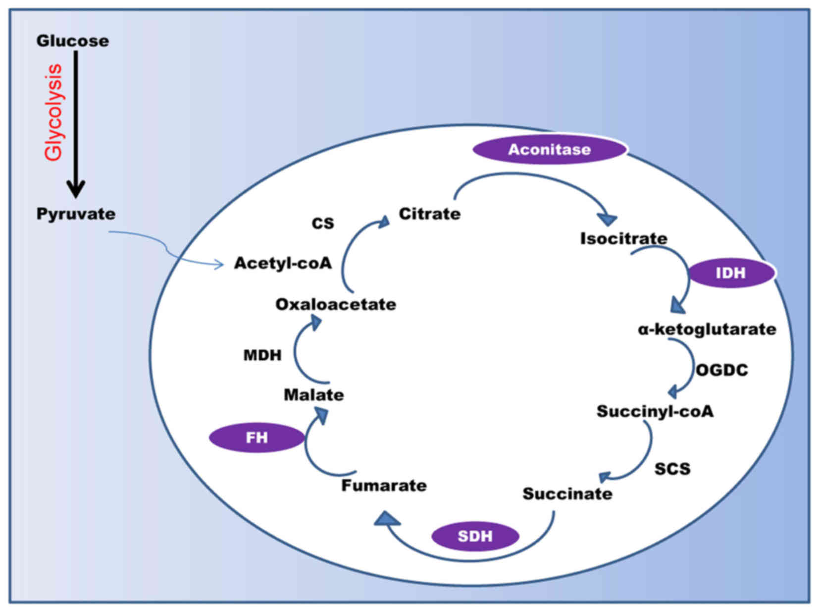 Pollard PJ, Wortham NC and Tomlinson IP: The TCA cycle and tumorigenesis: The examples of fumarate hydratase and succinate dehydrogenase. Ann Med. 35:632–639. 2003. View Article : Google Scholar : PubMed/NCBI | |