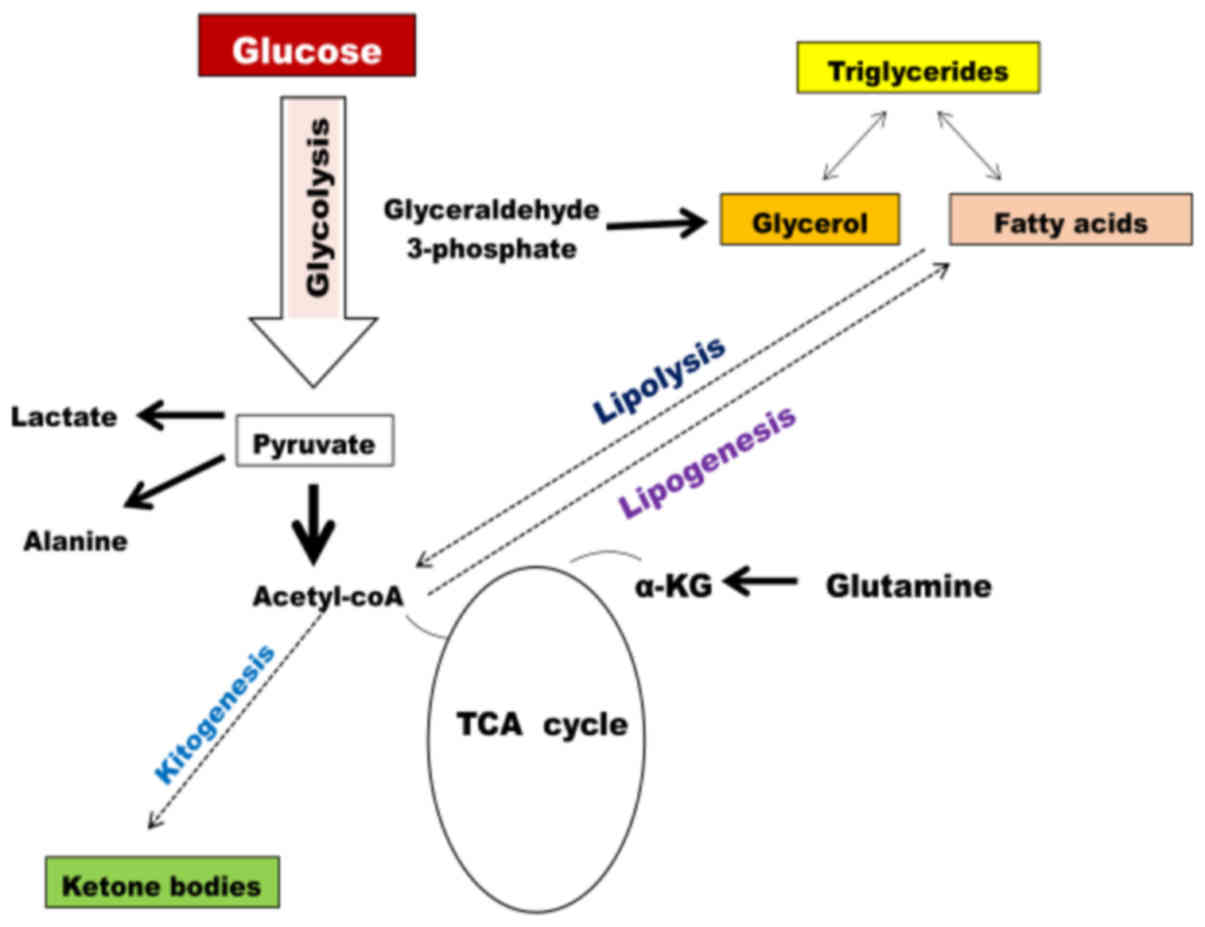 Increased glycose consumption, lactate production, PPP, lipid metabolism, and amino acid synthesis are commonly observed metabolic profile in almost all types of cancer cell. This type of metabolic profiling of tumor cells has been proposed to support their rapid cell growth (100). High rates of glycolysis leading to lactate production (aerobic glycolysis or the Warburg effect) distinguish cancer cells from normal cells (12,13). Glucose is a remarkable fuel for cancer cell, and a precursor for the supply of various metabolic intermediates, which are utilized for lipid, amino acid and nucleotide synthesis. Glutamine serves as another important source of fuel in cancer cells (65). Glutamine enters the mitochondria to replenish the Krebs cycle intermediates (66–69). Glutamine enters the Krebs cycle to produce α-KG, succinate, fumarate and malate. Highly proliferative cancer cells have a high demand for the rapid synthesis of lipids, amino acids and nucleotides (83–87). Tumor cells also divert carbon from glycolysis into the PPP (58), by which cancer cells synthesize macromolecules, such as nucleic acids. In addition, citrate and acetyl-coA are key intermediates for lipid synthesis (88–90). Since these metabolic pathways are interconnected, understanding the mechanism(s) leading to this metabolic switch in cancer cells is of utmost importance.