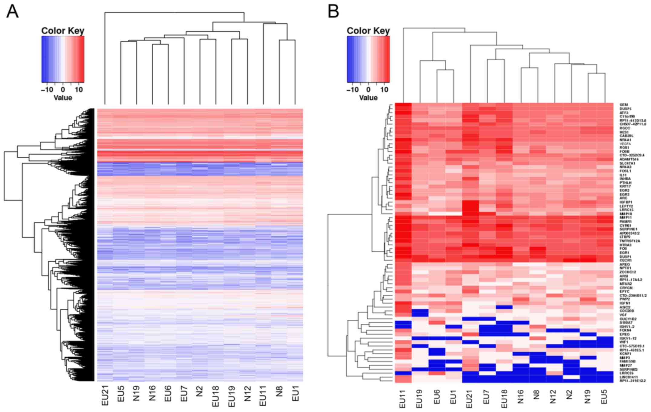 mRNA sequencing generated 1,396,127,582 reads, with an average of 107,204,492 reads per sample in the eutopic endometrium group and 107,698,330 reads per sample in the normal endometrium group. A fastQC quality test demonstrated that 1,374,958,606 (98.48%) reads had a Q-score ≥30, and thus were considered for further analyses. Of these reads, 93.71% were mapped to the hg19 and 98.61% were uniquely aligned. The detailed filtering and mapping data are presented in Table II.