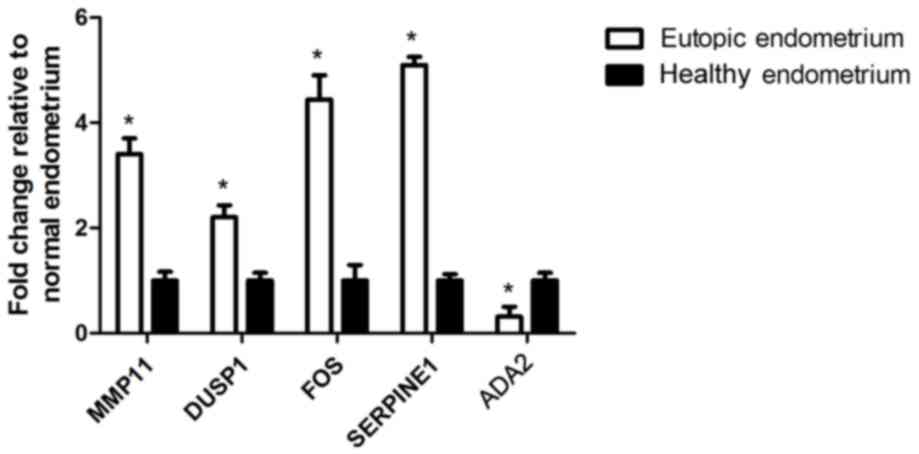 In conclusion, to the best of our knowledge, the current study presents the first genome-wide gene expression profile of eutopic endometria from women with endometriosis using a high-throughput sequencing technique. Seventy-two DEGs in eutopic endometria from women with endometriosis were compared with normal endometria from control subjects. GO analysis further revealed the important roles of these DEGs in the pathogenesis of endometriosis. Five genes, including MMP-11, DUSP1, FOS, SERPINE1, and ADA2 were further confirmed by RT-qPCR, and the results were consistent with the mRNA sequencing, indicating that these genes may present as novel biomarkers in the endometrium of women with endometriosis. The current study provides a comprehensive, but preliminary insight into elucidating the underlying mechanisms of this complex disorder, which merits further in-depth studies for confirmation.