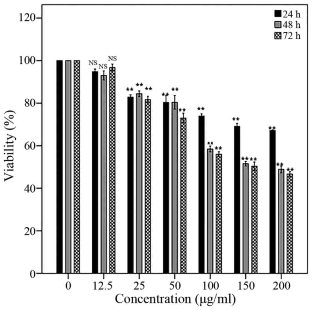 The anti-proliferative activity of the AW was assessed using MTT assay as previously described. Cells were plated onto 96-well plates at 5×103 cells/well in 0.1 ml RPMI medium. Following 24 h of incubation, cells were treated with 0, 12.5, 25, 50, 100, 150 and 200 µg/ml AW extract for 24, 48 and 72 h. Then, 20 µl MTT were added to each well and incubated at 37°C for 4 h. Then the culture medium was discarded and finally, 200 µl DMSO was mixed with the cells for solubilization of Formazan crystals and incubated in a dark place for 2 h at room temperature.