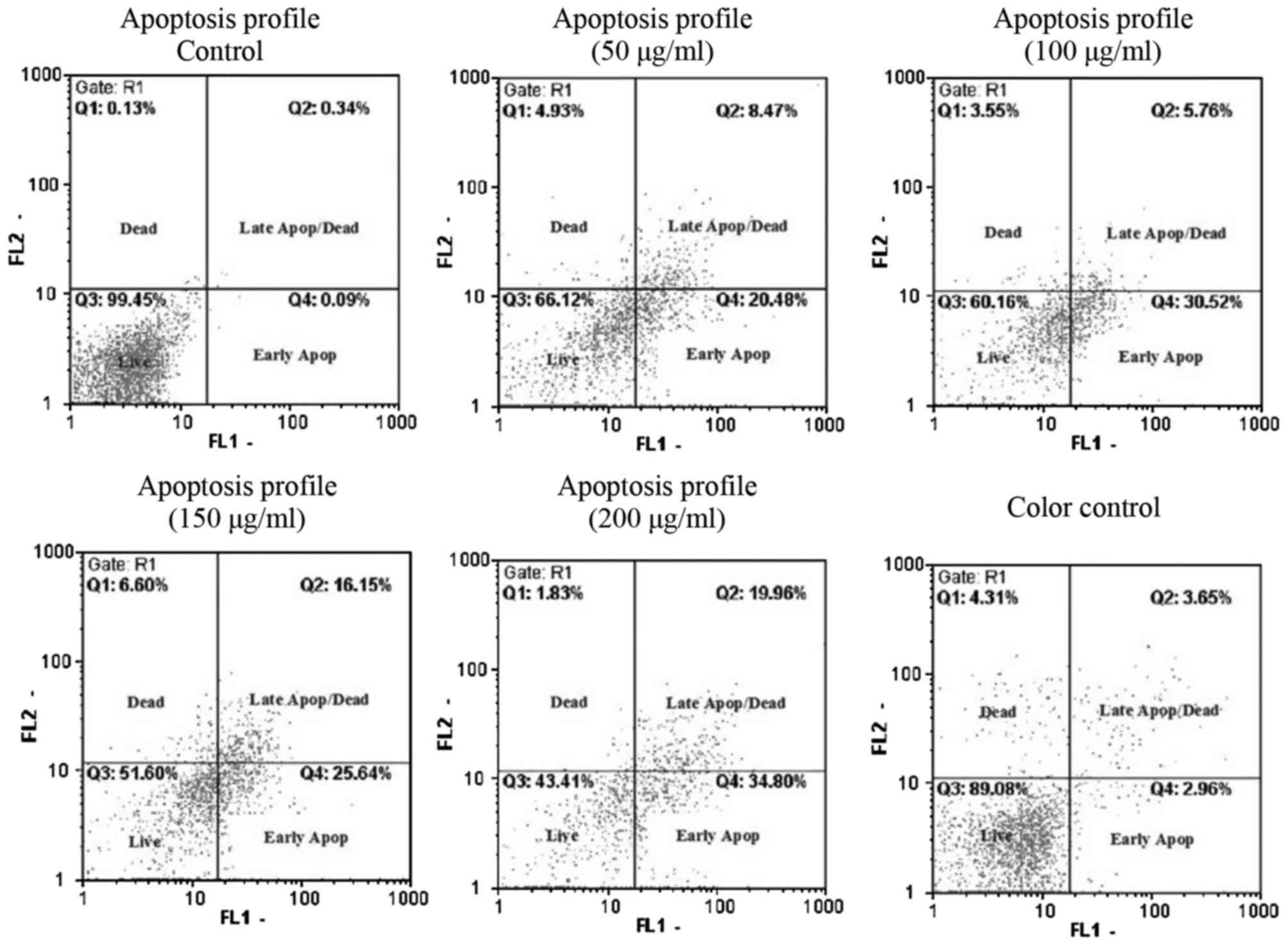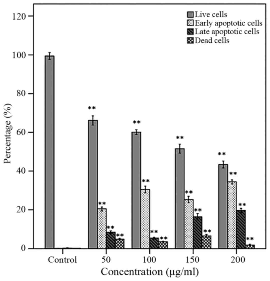Cell apoptosis was measured using Annexin V-Cy5 and propidium iodide (PI) staining and analyzed by flow cytometry (18). 1×105 cells per well were seeded in six well plates and incubated overnight, and then treated with 0, 50, 100, 150 and 200 µg/ml of HAWE for 48 h.