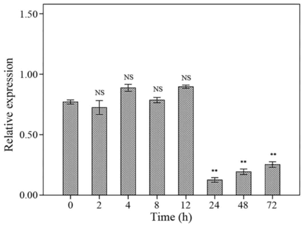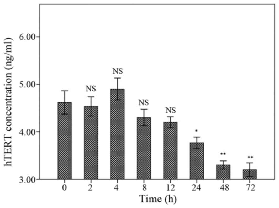 The hTERT levels have been presented in Fig. 5. Following treatment for 2, 4, 8 or 12 h, the hTERT levels were not different compared to control. The hTERT level was significantly decreased following 24 h treatment with marginal P-value (P=0.043). However, the hTERT levels were significantly declined in 48 and 72 h following treatment (P<0.001). There were no significant differences between 24, 48 and 72 h treatments (Fig. 5).