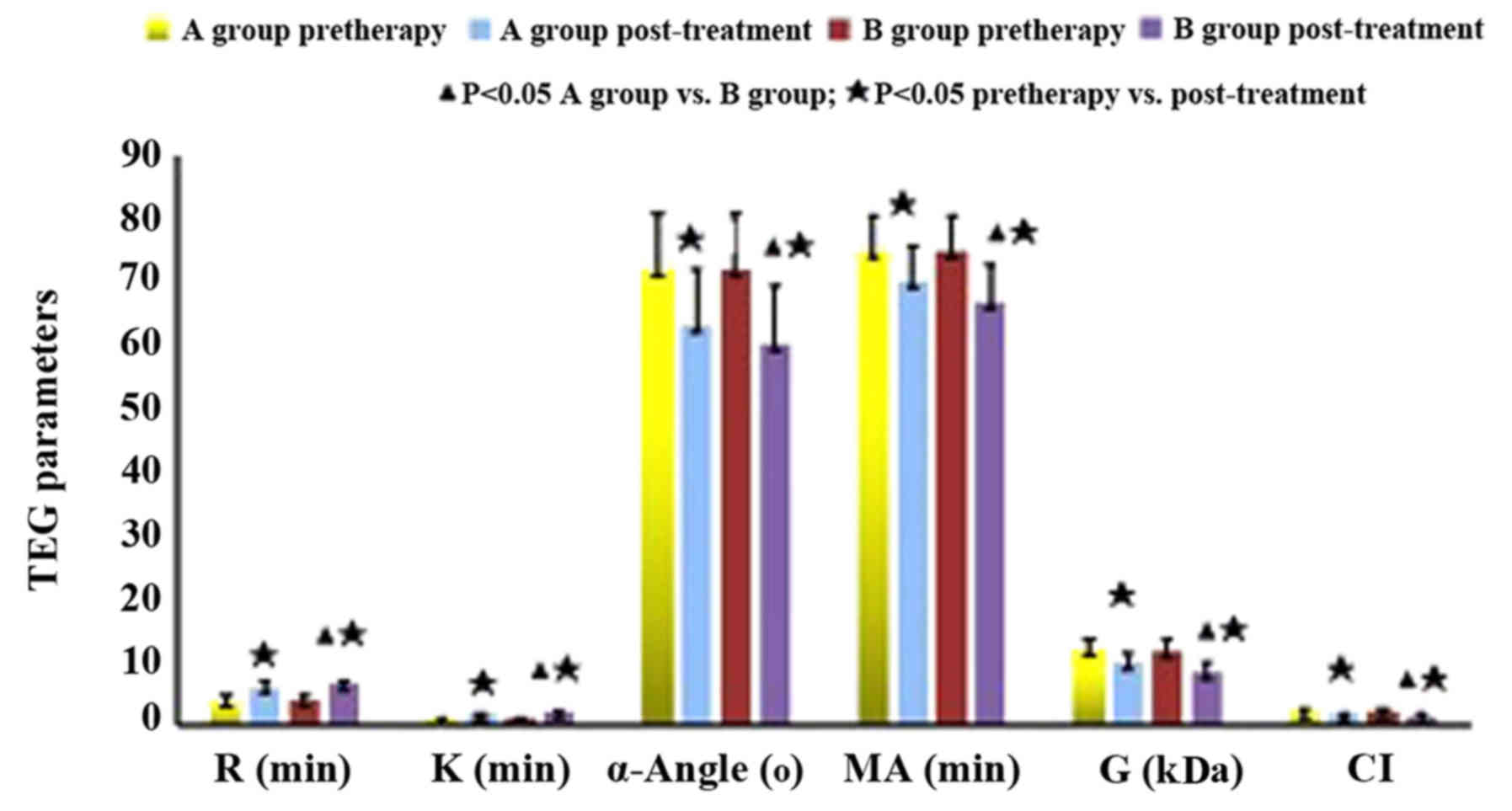 Blood samples were collected from the antecubital vein and tested with Thrombelastograph Analyzer TEG-500 (15). The tested parameters included: i) Reaction time (R), which indicated the time from the test start to the formation of the clot or fibrin. Normal R values ranged between 5 and 10 min; ii) clotting time (K), considered from the clotting start to the time when TEG amplitude reached 20 mm. Normal K values ranged between 1 and 3 min; iii) α-angle, which was the angle between the tangent line and the horizontal line of the maximum curve when TEG reached the maximum curve from clot formation, representing the speed of clot formation and the speed of hemocoagulase formation. Normal α-angle was between 53 and 72°; iv) maximum amplitude (MA), which was the maximum solidness of thrombus, reflecting the absolute clot intensity. Normal values were between 50 and 70 mm; v) clot strength (G): G value was a measure of clot strength or clot firmness, and was calculated based on the amplitude value until the MA was reached. Normal G values were between 4.6 and 11 kDa; vi) coagulation index (CI): −3< normal <+3; index <-3 indicated low coagulation; index >-3 indicated high coagulation. If two or more of the following conditions were met, it was diagnosed as hypercoagulable state: R and K were shortened and α-angle and/or MA were increased.