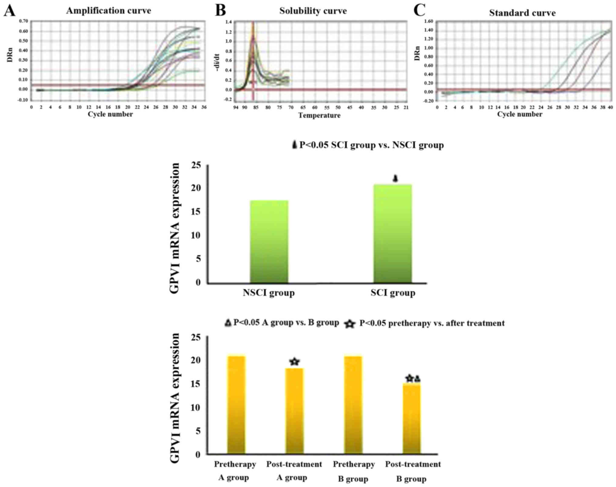 Total RNA was extracted with TRIzol (Takara Bio, Inc., Otsu, Japan) according to the manufacturer's instructions. For RT-qPCR, cDNA was synthesized using the PrimeScript RT-PCR kit (Takara Bio, Inc.). The primers (Shanghai Biotechnology, Shanghai, China) used to detect human GPVI and β-actin (internal control) were: GPVI forward, 5′-GCCAAGCTATTGCGACATGA-3′ and reverse, 5′-AAAAGAATCTCAATGTCCGAGACTTT-3′; β-actin forward, 5′-GGAGCGAGATCCCTCCAAAAT-3′ and reverse, 5′-GGCTGTTGTCATACTTCTCATGG-3′. The cDNAs were amplified using the following thermal cycle: Denaturation at 95°C for 1 min, followed by 35 cycles of denaturation at 95°C for 30 sec, annealing for 1 min at 58°C, polymerization for 1 min at 70°C, and brief detection at 70°C. The signal was expressed relative to β-actin (relative ratio = average copy number of target gene in the sample/average copy number of β-actin).