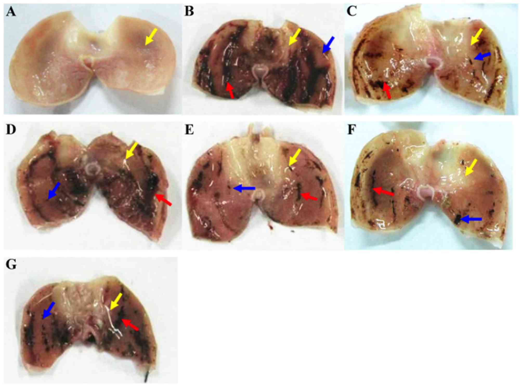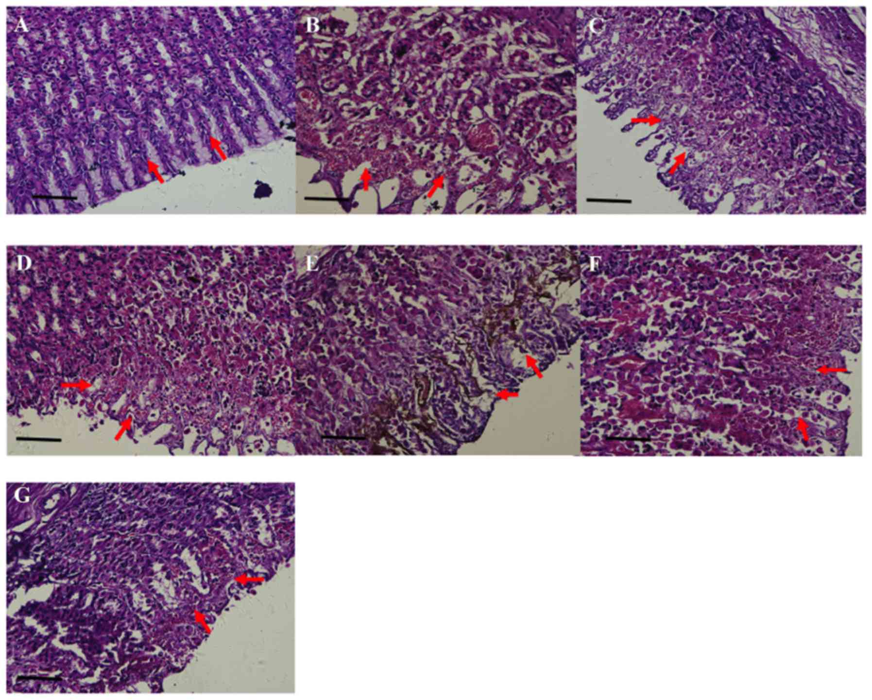 The formalin-fixed stomach tissues were embedded in paraffin wax and gradient dehydrated in increasing concentrations of ethanol (70–100% v/v). The specimens were sectioned (4-µm thick) and stained with hematoxylin (~1.5 min) and eosin (30 sec) at room temperature for histopathological examination. An epithelial damage scoring system (34) was applied to rate histopathological changes, including congestion, edema, hemorrhage, degeneration and necrosis in the gastric mucosa, by light microscopy (×400), as described in Table II. The total score of pathological changes was calculated by the formula: Total score = hyperemia points + (bleeding points ×2) + (degeneration and necrosis points ×3) (34).