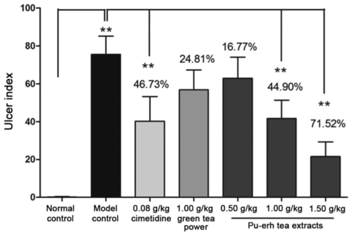 Pu-erh tea is a type of fermented tea that incorporates microorganism metabolites during the fermentation process (1). It is prepared from processed leaves and buds of the broad-leaf variety of the tea plant [Camellia sinensis var. assamica (L.) O. Kuntze; Theaceae], primarily grown in Yunnan province of China (2). Pu-erh tea is widely consumed worldwide as part of a normal diet. Its chemical components and properties vary due to the time of year that the tealeaves are harvested and the fermentation methods used. The main components of Pu-erh tea extracts include tea polyphenol, tea pigment, tea polysaccharide and alkaloids (3). In previous years, studies on the potential health-beneficial effects of Pu-erh tea have identified a range of biological activities, including anti-oxidation (4), anti-obesity (5), anti-inflammation, anti-immunosenescence (6), anti-hyperlipidemic (7), antitumor (8), antiviral (9) and antibacterial (10) effects. However, its potential action in reducing or limiting gastric mucosal injury and the mechanisms associated with these effects have not been experimentally clarified.