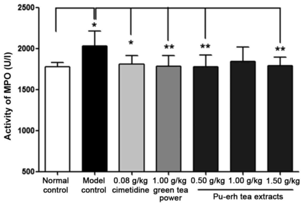 MPO, a biomarker for neutrophil-dependent inflammation, is mainly released from neutrophils, and therefore is also an essential marker for normal neutrophil function. MPO and other tissue-damaging substances including reactive oxygen metabolites and cytotoxic proteins are released into the extracellular space when neutrophils are stimulated (44,45). Ethanol administration causes an increase of mucosal MPO activity, which thus indicates that the level of activated neutrophils secreting oxygen radicals is increased (46,47). In the present study, absolute ethanol induced an increase of MPO activity in the model control compared with the normal control. The pretreatment of Pu-erh tea extracts prior to this alcohol induction suppressed the release of MPO, compared with the model control, which may indicate that the degree of inflammation induced by neutrophils was also inhibited.