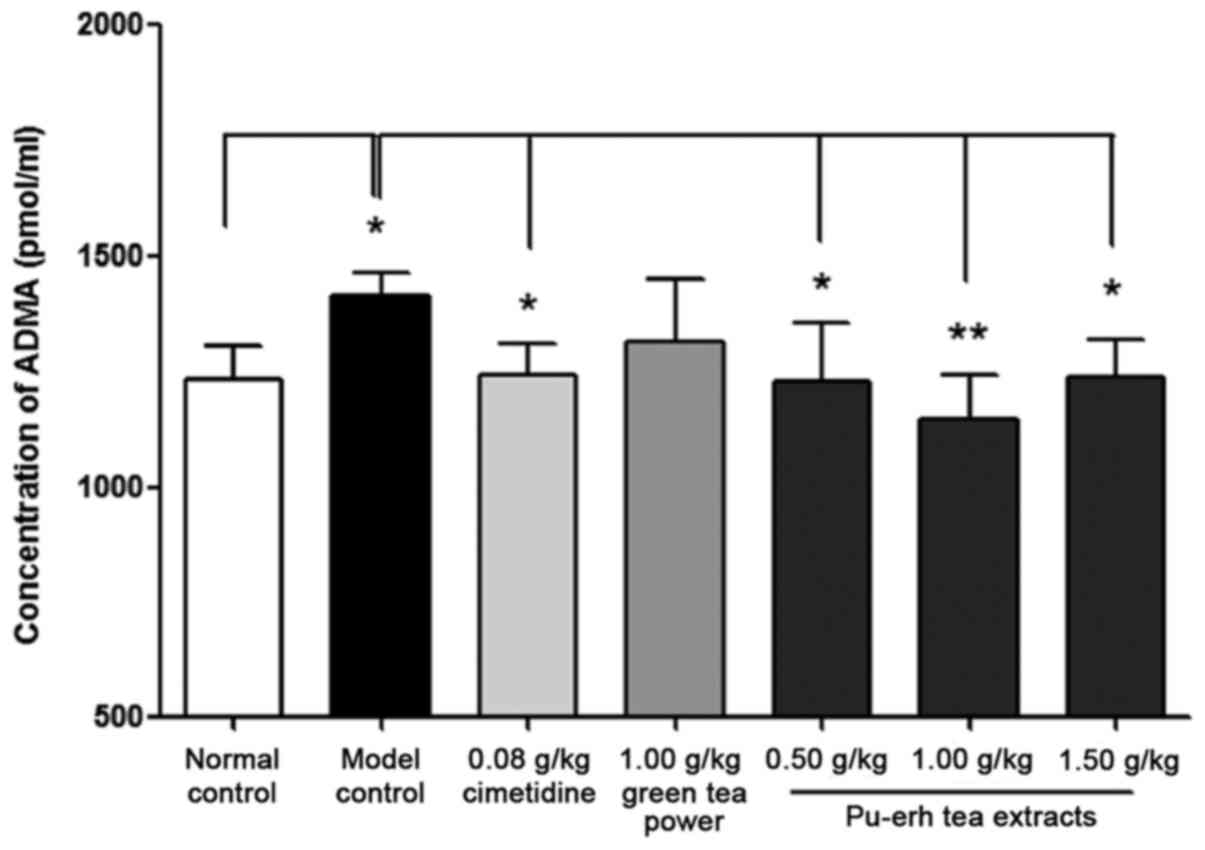 In conclusion, the study present focused on the protective effect of Pu-erh tea extracts in the gastric mucosa. Absolute ethanol was used to induce gastric mucosal injury and the action of Pu-erh tea extracts was investigated. The extracts exerted significant protective effects against the gastric mucosal damage. The human equivalent of the rat dose 1.00 g/kg is 0.16 g/kg, according to the dose conversion relationship of the Food and Drug Administration (55), which is equivalent to physiological tea consumption in humans. The effect of Pu-erh tea extracts was greater than that of green tea powder. Pretreatment with Pu-erh tea extracts prior to the intragastrical administration of absolute ethanol inhibited the activity of MPO and decreased the concentration of ADMA compared with the pre-administration of distilled water. These protective effects of Pu-erh tea extracts against gastric mucosal damage may be due to its preservation of the gastric mucus layer as well as roles in decreasing inflammation and increasing NO production.