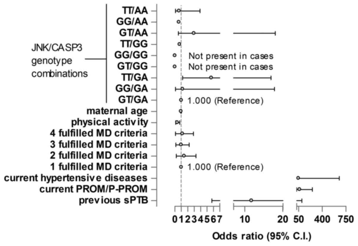 The JNK/CASP3 genotype combination in maternal blood, maternal age, physical activity, diet, current hypertensive diseases, current P-PROM/PROM and previous sPTB were the selected variables to be analysed. The GT/GA genotype was selected as the reference genotype. The TT/GA genotype of JNK/CASP3 was significantly associated with sPTB; pregnant women carrying the TT/GA genotype had higher risk of sPTB than those with the reference genotype GT/GA (OR, 5.7; P=0.037) independently of all other maternal factors. Physical activity reduced the risk of sPTB (OR, 0.309; P=0.009). Current hypertensive diseases, PROM/P-PROM in the current pregnancy and previous sPTB significantly increased the risk of sPTB (ORs, 47.2, 65.6 and 11.7; P=0.004, <0.001 and 0.03, respectively; Fig. 1).