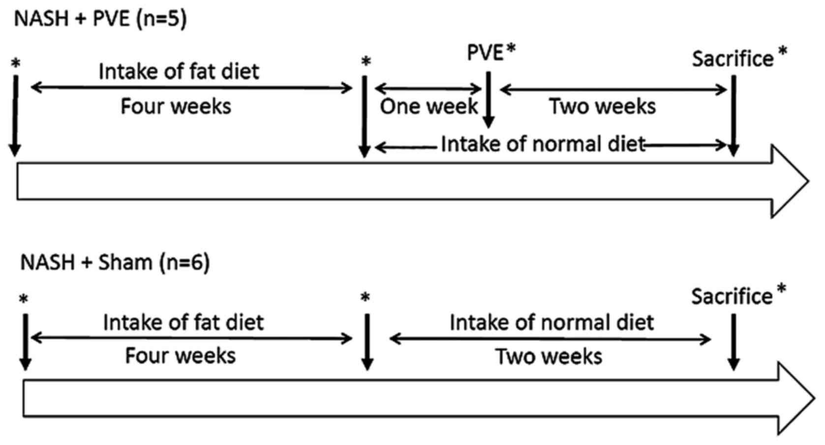Several limitations to the present study must be considered. First, there was a lack of data regarding hypertrophy of the non-embolized liver lobe and shrinkage of the embolized liver lobe following PVE. Second, measurement of d-ROM and BAP may have been somewhat variable in this study due to the chylous appearance of plasma samples. Standardization of measurements was therefore performed by skimming fatty components with PE prior to ordinary assays for BAP and d-ROM in the FRAS4. Third, there was no checking of sequential changes in liver volume pre and post-PVE. Thus the effects of PVE on liver tissue could not be objectively confirmed. Fourth, results of pathological examinations associated with NASH grade and score between normal and NASH groups were based on limited (n=13) resected specimens. This incomplete pathological examination was attributed to unknown technical or other miscellaneous errors. Additionally, pathological specimens were examined 2 weeks after resuming a normal diet in the NASH group. Although it is uncertain whether the pathological changes associated with NASH are reversible after stopping intake of a high-fat diet, this change may have had some effect on the non-embolized liver lobe at the time of sacrifice. Fifth, neither high fat diet feeding nor PVE was compared with the matched controls.