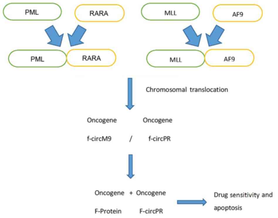 There are inherent chromosomal translocations in various types of leukemia. A recurrent translocation is PML-RARA in patients with acute promyelocytic leukemia (APL) (52). Recently, studies on circRNA expression in AML have been conducted. Guarnerio et al (6) demonstrated that circRNAs are derived from the transcription of fusion genes that occur from chromosomal translocations. Indeed in various studies, circRNAs have been associated with many cancers, including AML with MLL-AF9 and promyelocytic leukemia with PML-RARA. Many are established as f-circRNAs. Abnormal expression of circRNAs may be the result of distant interrelated introns and introns of translational genes that contain repeating sequences complementary to each other. Novel back-splicing events are supposed to support their formation into abnormal circRNAs (53).