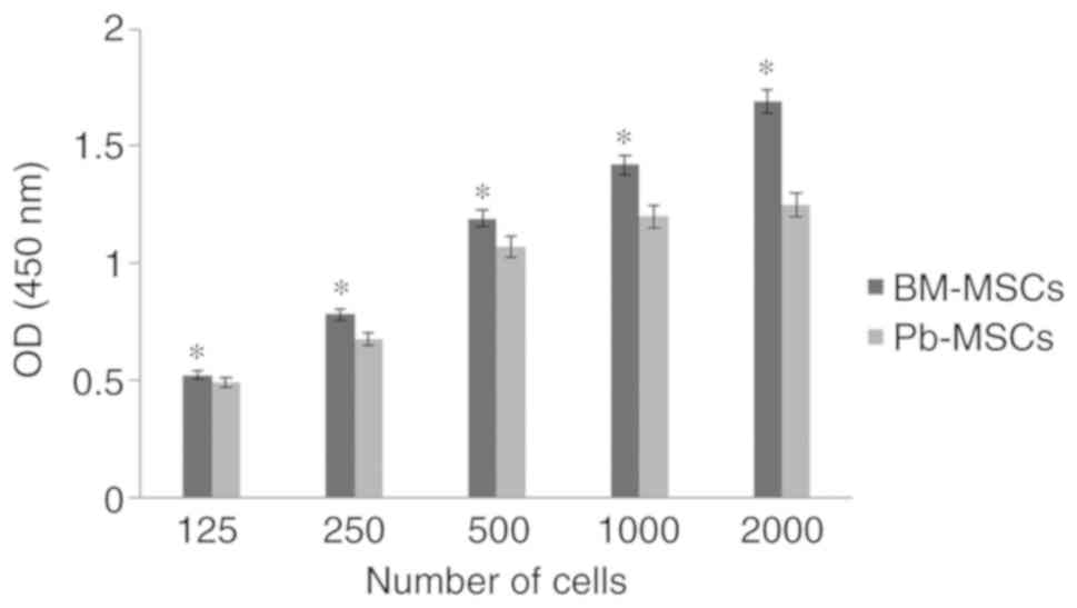 BM-MSCs showed a significantly greater optical density in XTT assays compared with PB-MSCs (P<0.05) and the difference increased as the cell number increased, indicating that BM-MSCs have a higher proliferative rate than PB-MSCs (Fig. 1).