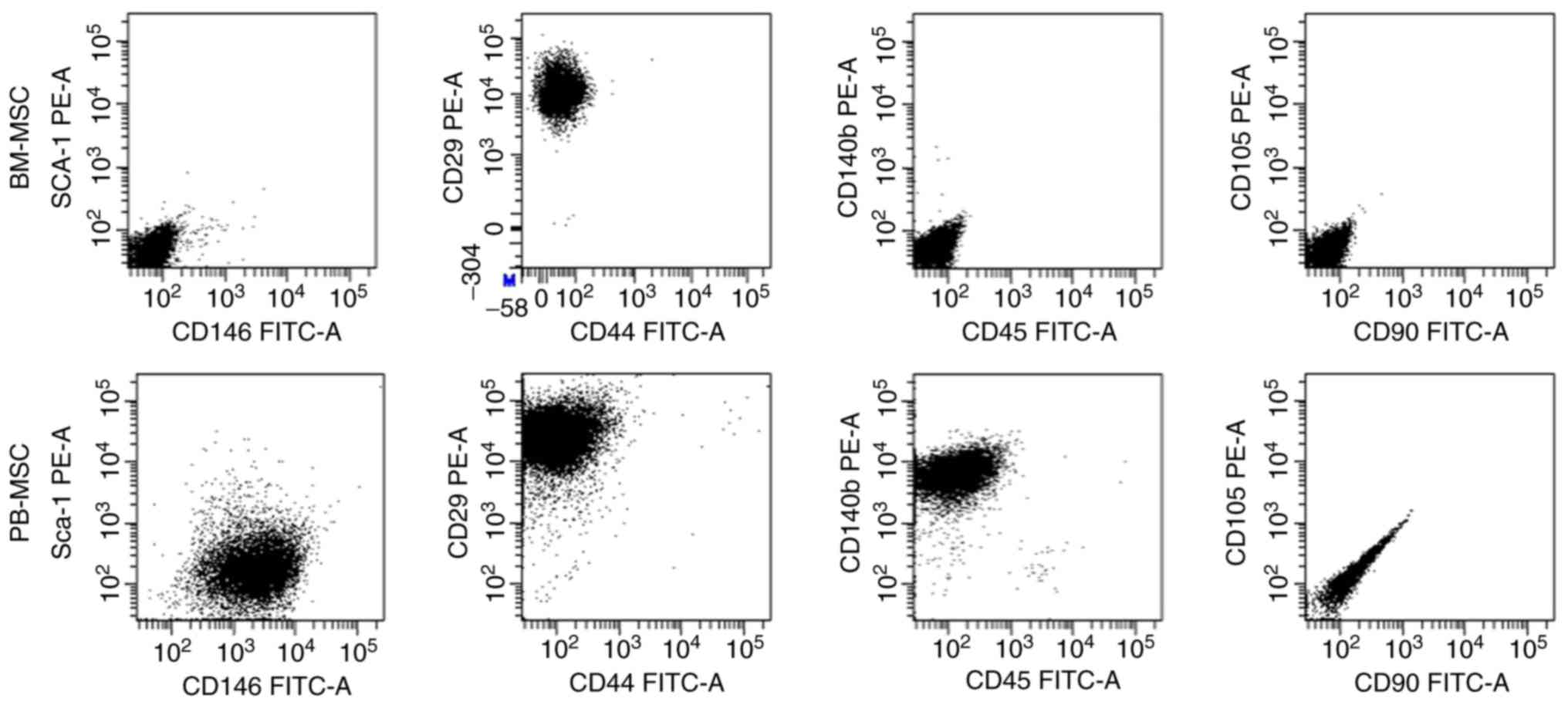 Cultures of passage 4 BM-MSCs and PB-MSCs were analyzed for the expression of cell-surface markers (Fig. 2). BM-MSCs were positive for CD29 and negative for all other markers. PB-MSCs were positive for CD146, CD29 and CD140b and negative for Sca-1, CD44, CD45, CD90 and CD105.