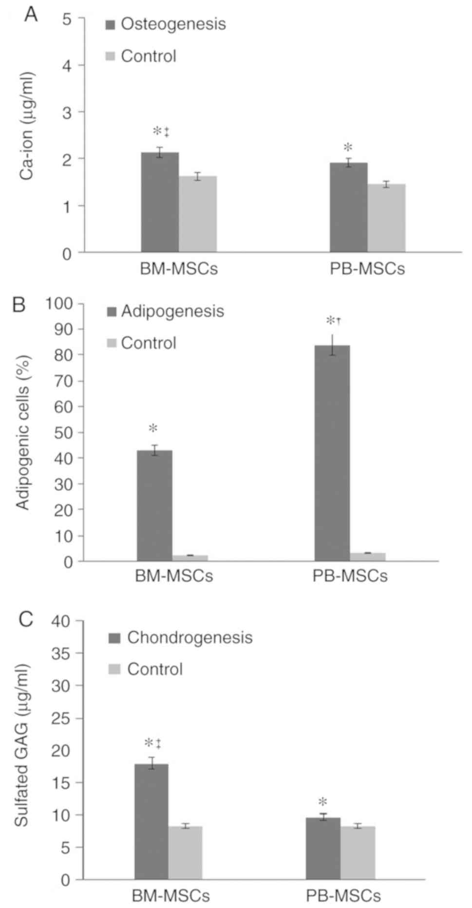 BM-MSCs and PB-MSCs tended to differentiate into chondrocytes (Fig. 3E and F), but BM-MSCs showed stronger production of sulfated GAG compared with PB-MSCs. The concentration of sulfated GAG in differentiated BM-MSCs was 17.93±2.44 µg/ml. The concentration of sulfated GAG in differentiated PB-MSCs was 9.66±1.02 µg/ml (Fig. 4C).