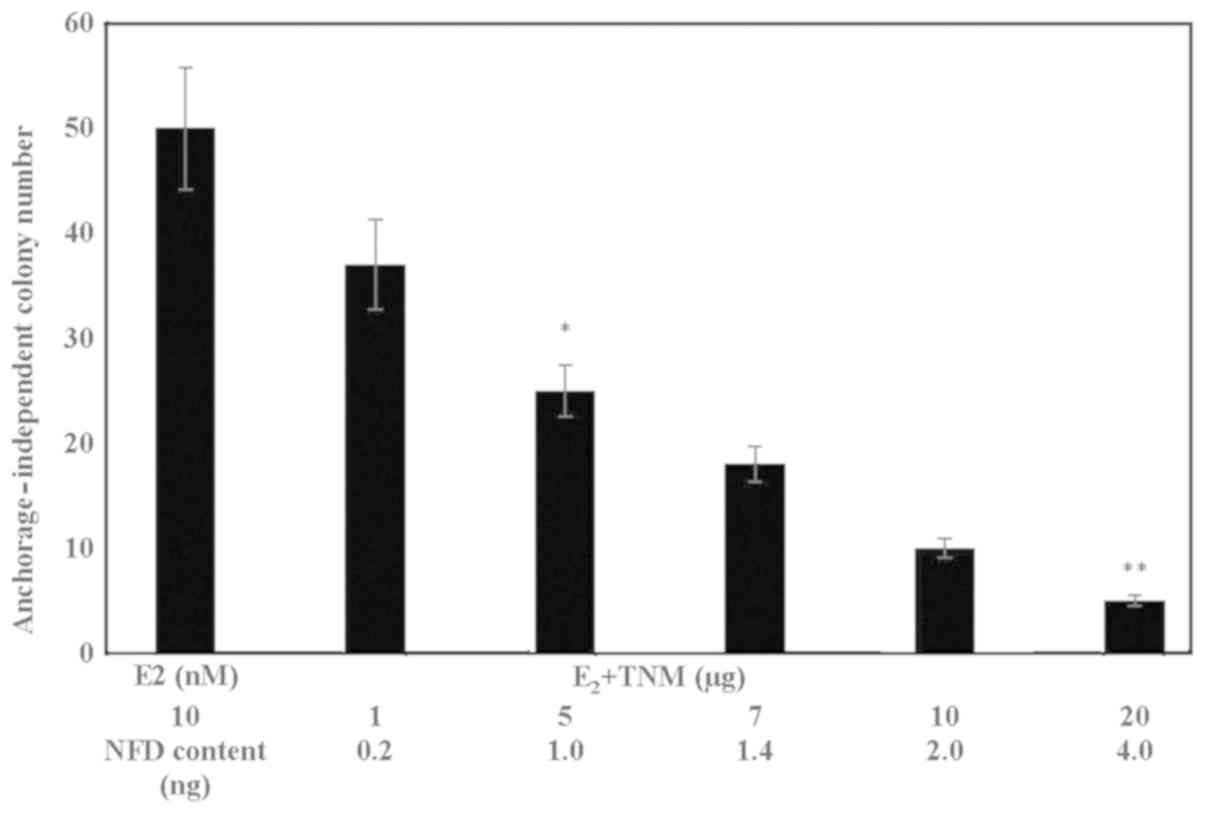 The ER-α-positive human mammary carcinoma-derived MCF-7 cell line is dependent on E2 for anchorage-independent growth in vitro and tumor development in vivo. These in vitro and in vivo end points exhibit a strong positive correlation (27). Thus, the in vitro endpoint that determines the number of AI colonies is a surrogate end point biomarker for cancer risk. E2 promoted anchorage-independent colony number was reduced in response to the treatment with TNM in MCF-7AROM cells. In this context, it is noteworthy that several mechanistically distinct nutritional herbs have demonstrated inhibitory effects on anchorage-independent colony formation in MCF-7 cells (28-31), suggesting their potential efficacy for the reduction of breast cancer risk.
