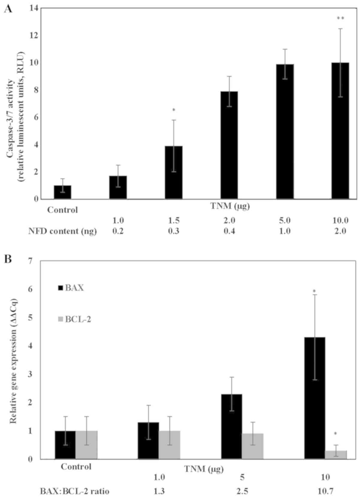 At the molecular level, TNM treatment resulted in a dose-dependent increase in pro-apoptotic BAX and a reciprocal decrease in anti-apoptotic BCL-2 gene expression. Thus, treatment with 10 µg TNM resulted in a 3.3-fold increase (P=0.01) in the pro-apoptotic BAX and a 70% decrease (P=0.02) in the anti-apoptotic BCL-2 expression, relative to the respective untreated controls. This reciprocal modulation in the expression of apoptosis-specific genes resulted in an increased BAX: BCL-2 ratio (Fig. 2B).