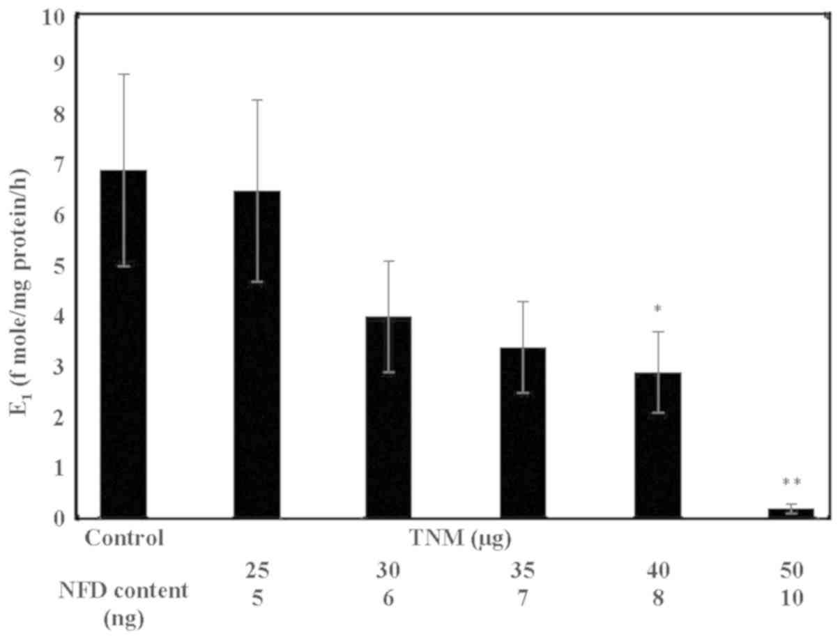 The comparative efficacy of TNM and LET for inhibition of aromatase activity revealed that the extent of inhibition of 63.8% (P=0.04) by 40 µg TNM (NFD content 8 ng) was essentially similar to 62.3% inhibition (P=0.04) induced by 285 ng (1 µM) of LET, relative to the untreated control (Table III).