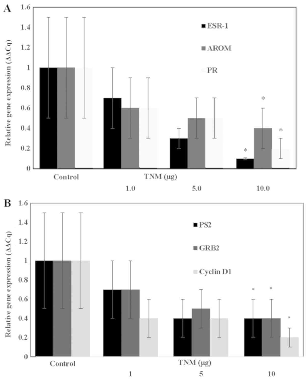 The data shown in Fig. 4B examined the effect of TNM on the expression of select E2 responsive genes. The extent of inhibition at 10 µg of TNM for pS2 was 62% (P=0.04), for GRB2 it was 61% (P=0.04), and for cyclin D1 it was 82% (P=0.01). Thus, TNM treatment resulted in a substantial downregulation of E2 responsive gene expressions.