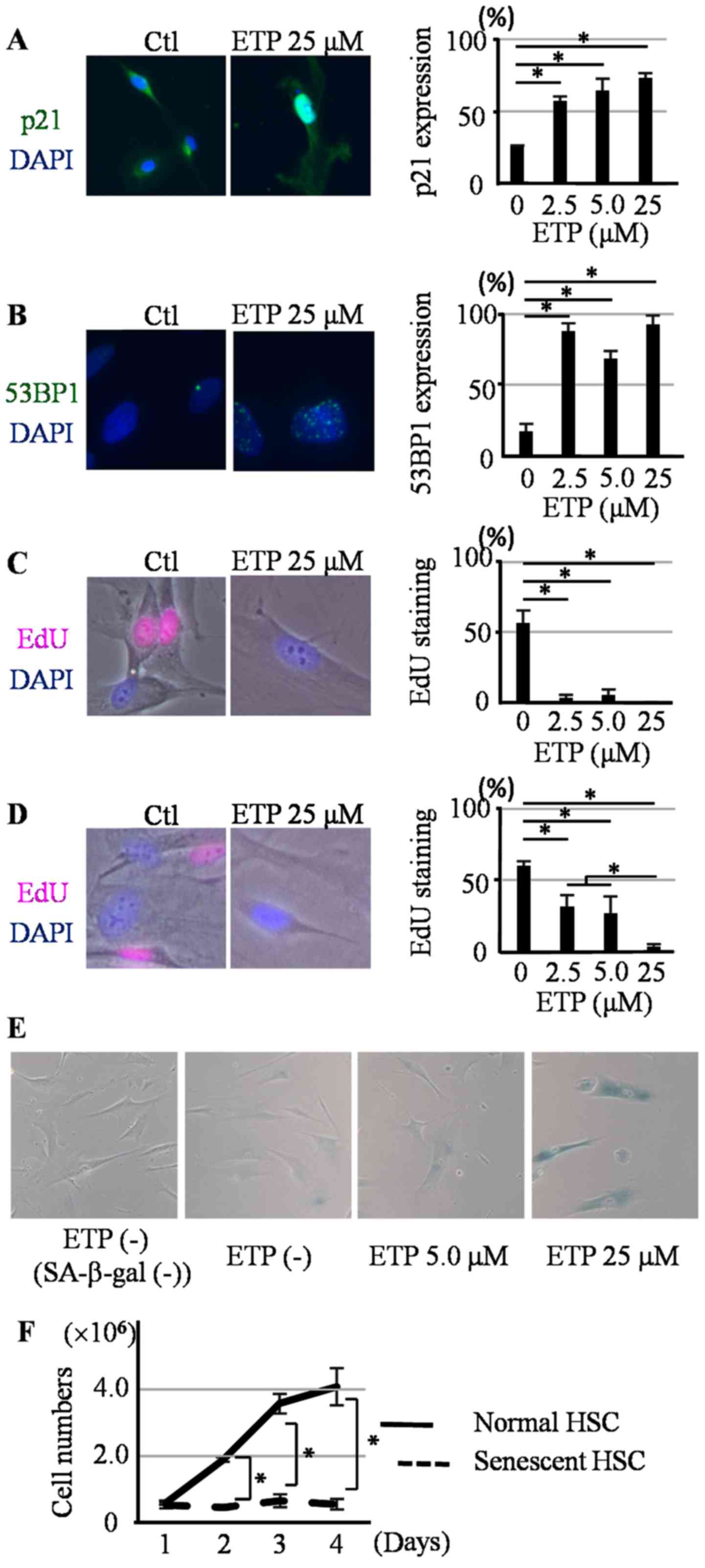 Cellular senescence was induced by ETP treatment and confirmed by observing p21 and 53BP1 expression in HHSteCs using immunofluorescence assays. A total of 5x104 HHSteCs were mounted on four-chamber slides (Lab-Tek II; Thermo Fisher Scientific, Inc.) and treated with various concentrations of ETP for 3 days. Subsequently, cells were fixed with 4% paraformaldehyde for 30 min at room temperature, permeabilized with ice-cold 70% ethanol and blocked in 1% BSA for 1 h at room temperature. Primary antisera, 1:200 rabbit anti-p21 (cat. no. 29475; Cell Signaling Technology, Inc.) or 1:200 rabbit anti-53BP1 (cat. no. IHC-00001; Bethyl Laboratories, Inc.) were added and the cells were incubated for 1 h at 20-25˚C. After washing the cells with PBS, secondary antisera (AlexaFluor 488-conjugated donkey anti-rabbit IgG; 1:1,000; cat. no. A11008; Molecular Probes; Thermo Fisher Scientific, Inc.) was added to the cells and incubated for 1 h at room temperature. The slides were washed, and coverslips were mounted with DAPI Fluoromount-G (SouthernBiotech). The uptake of EdU was observed in the HHSteCs treated with ETP for 3 days, and for cells left to recover, for another 3 days in normal medium following treatment. EdU staining of the HHSteCs was performed using a Click-iT EdU AlexaFluor 594 imaging kit (cat. no. C10339; Thermo Fisher Scientific, Inc.) for 4 h according to the manufacturer's protocol. Images were acquired using a Keyence All-in-One fluorescence microscope (Keyence Corporation) at x100 magnification. SA-β-gal staining was performed using a Senescence β-Galactosidase Staining kit (Cell Signaling Technology, Inc.) according to the manufacturer's protocol. All assays were performed at least in duplicate.