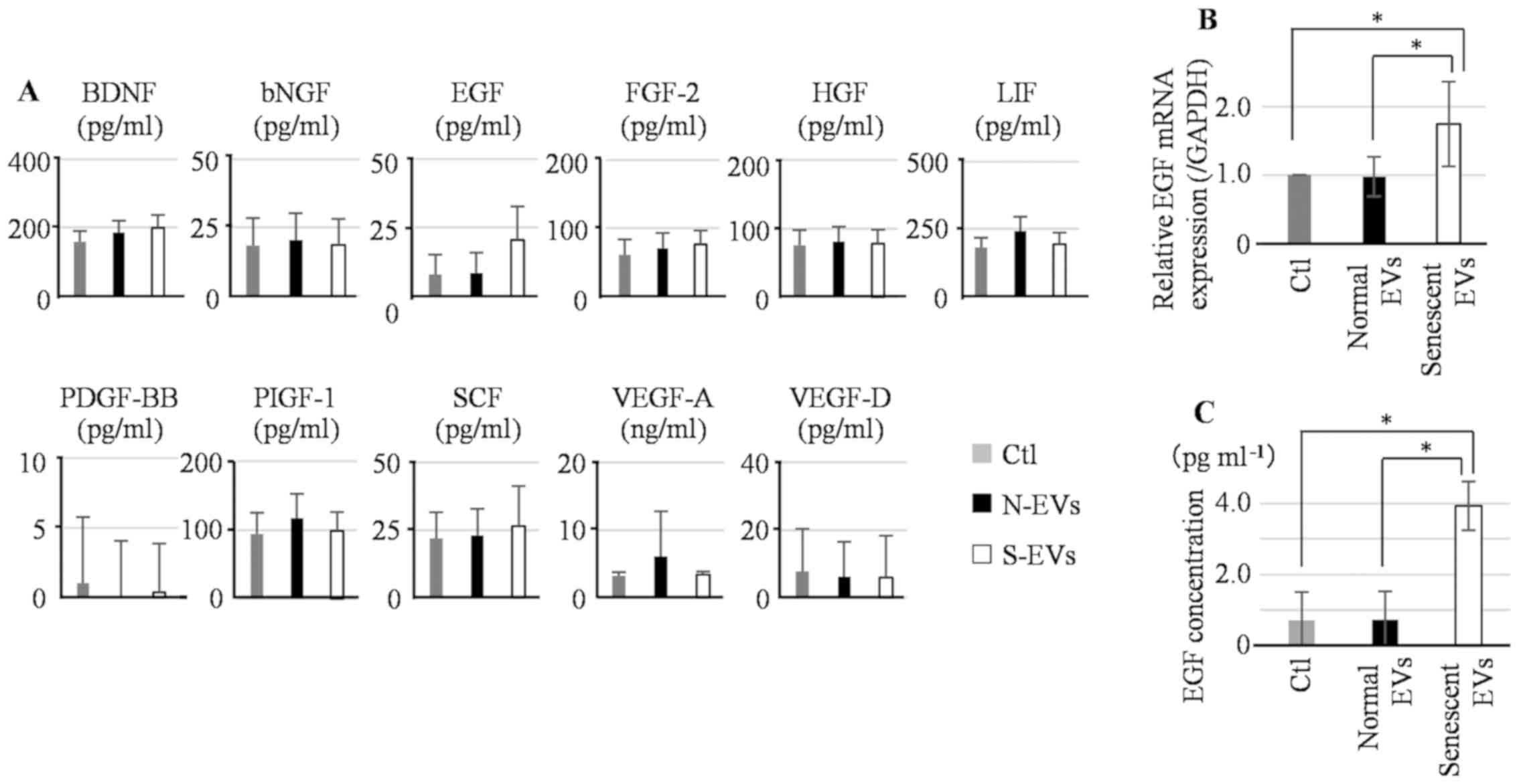 EGF expression in THP-1 cells treated with EVs was further assessed by RT-qPCR and EGF protein-specific ELISA. The levels of EGF mRNA expression in THP-1 cells treated with senescent EVs was significantly higher compared with both the THP-1 cells treated with normal EVs and control (Fig. 3B). To further confirm the results obtained by multiplex immunoassays, EGF secretion was measured using ELISA. EGF secretion from THP-1 cells treated with senescent EVs was also increased compared with THP-1 cells treated with normal EVs and the control (Fig. 3C).