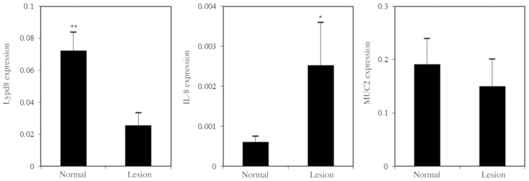 The expression levels of IL-8 were slightly higher in the lesioned regions compared with the normal regions of the colon (0.000431±0.00445 vs. 0.000327±0.000601, respectively; P<0.05; Fig. 1). In contrast, the decrease in LYPD8 expression levels in the lesioned regions compared with normal regions was significant (0.0156±0.0335 vs. 0.0591±0.0485, respectively, P<0.001; Fig. 1).
