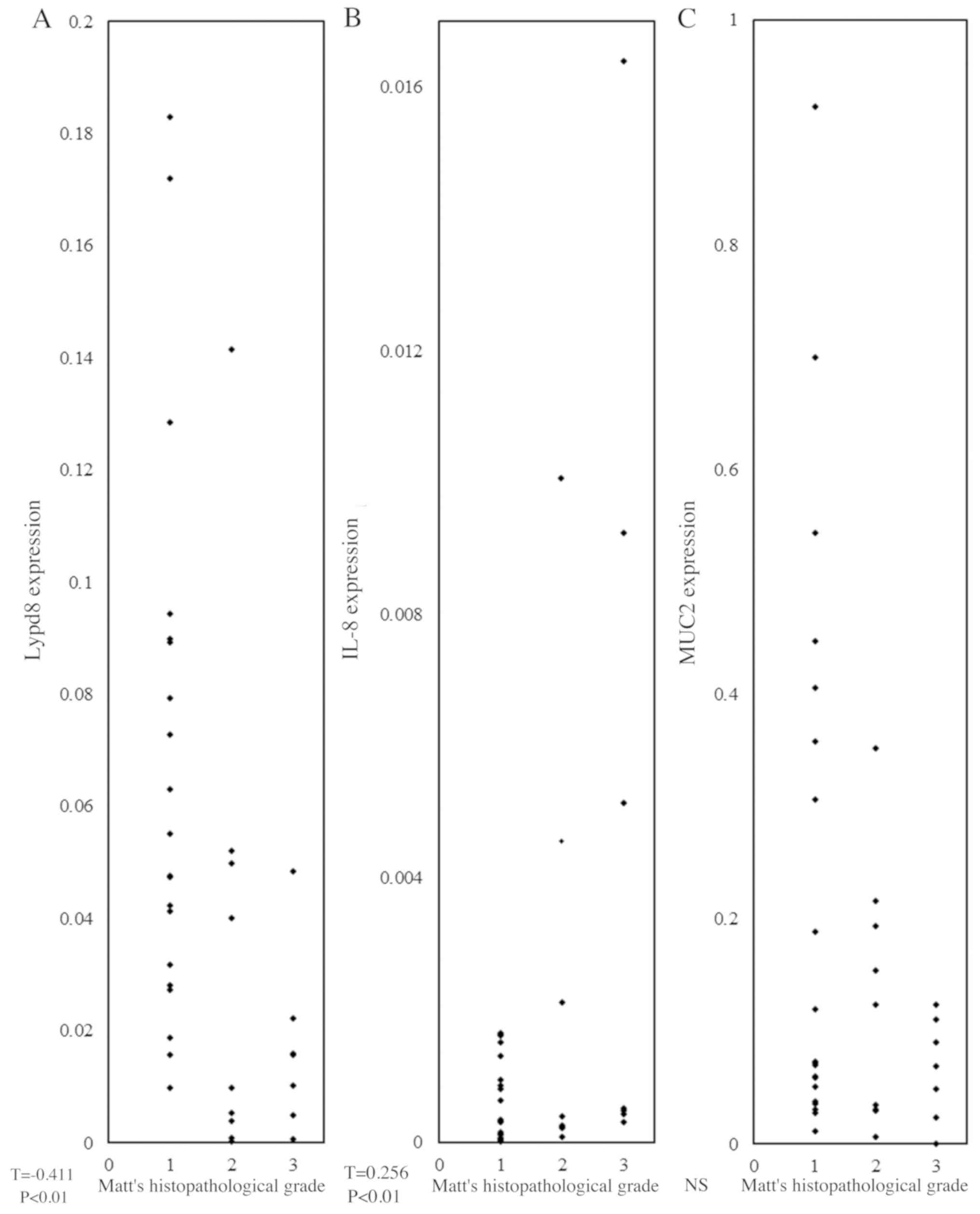 There was a positive correlation between Matts' histopathological grade and IL-8 expression levels (T=0.256; P<0.01; Fig. 2), whereas a negative correlation was observed between Matts' histopathological grade and LYPD8 expression levels (T=-0.411; P<0.01; Fig. 2). There was no correlation between Matts' histopathological grade and MUC2 expression levels (Fig. 2).