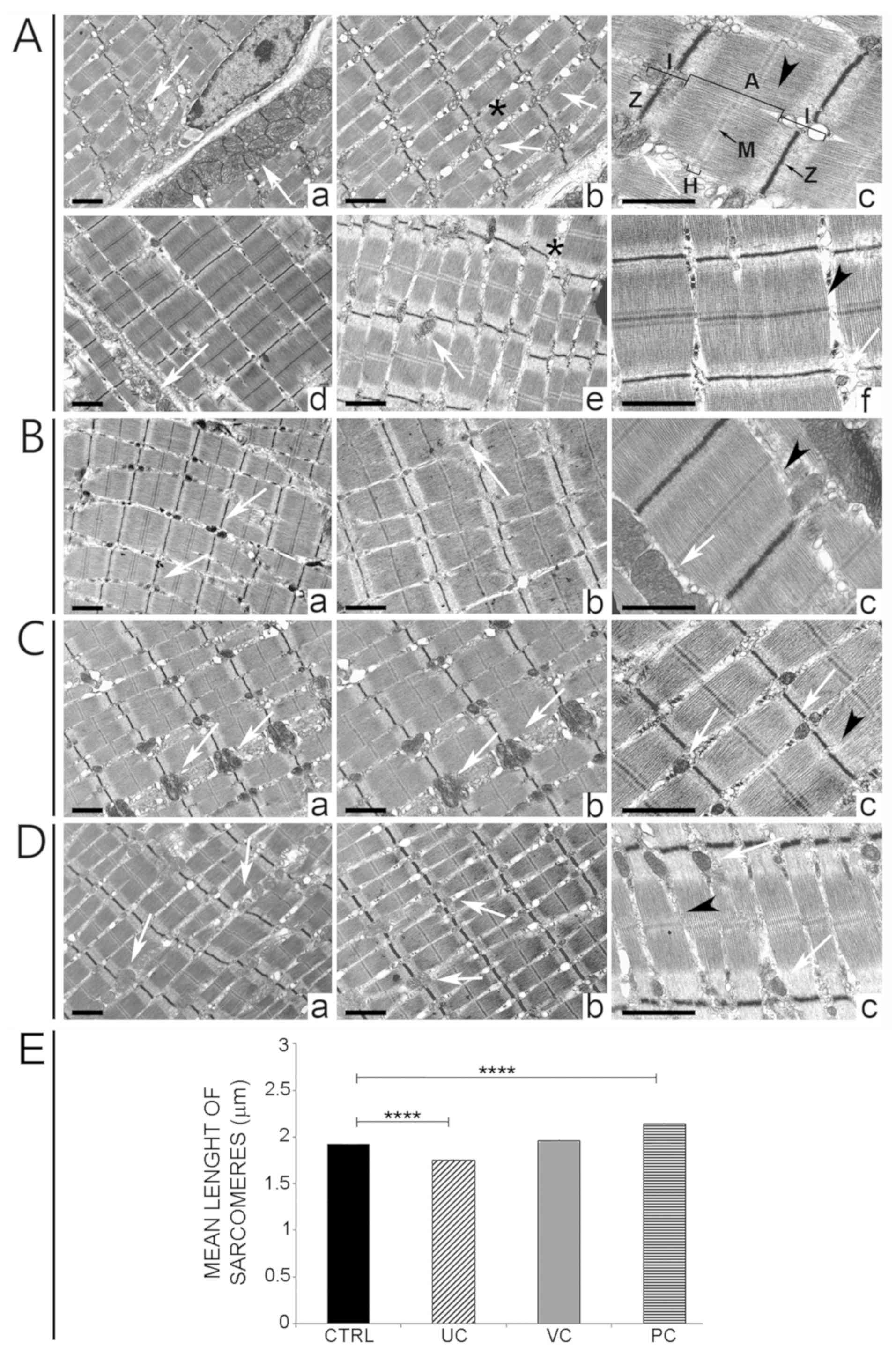 Analyzing the length of the sarcomeres following the different protocols showed that there was a significant decrease in sarcomere length in the UC-trained mice, and a significant elongation in the PC-trained mice. The shortening of sarcomeres observed in the UC mice may suggest an impaired capacity to generate short bursts of high energy muscle contractions and reduced muscle tissue flexibility; whereas the elongation of the sarcomeres in the PC group may have improved flexibility and preserved the capacity to generate short bursts of high energy muscle contractions. The length of sarcomeres in the VC group was similar to that of the control group, thus suggesting that both flexibility and short burst generation capacity are preserved (5,6,28,29). The variations in length of the sarcomere might be related to the motor efficiency as also suggested by the in vivo results of the cross over test.