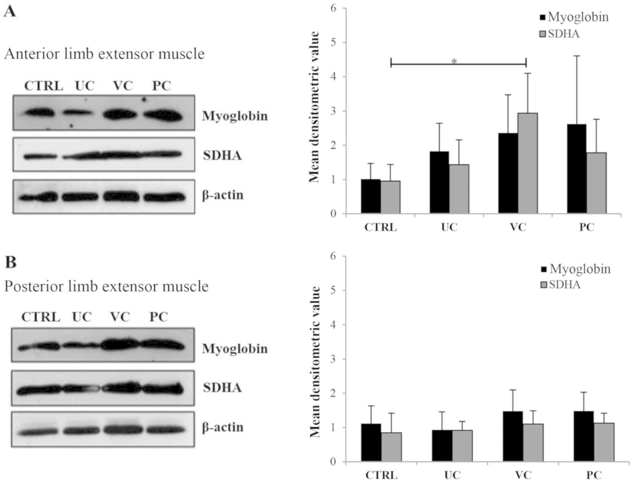 Muscle tissues from the right part of the animals were collected. Samples were taken from the posterior extensor, sural triceps and brachial triceps. Whole mounts of these muscles were taken, cut in two pieces, placed in sterile plastic tubes and stored in liquid nitrogen. Two samples from each muscles were taken (6 samples from each animal), thus a total of 96 samples were available for biochemistry. Proteins were extracted from muscle tissues using a lysis buffer (10 mmol/l HEPES, 1 mmol/l EDTA, 60 mmol/l KCl, CA-630 0.2% Igepal, 1 mmol/l sodium fluoride, 10 µg/ml aprotinin, 10 µg/ml leupeptin, 1 mmol/l DTT, 1 mmol/l PMSF). Protein concentrations were quantified by spectrophotometry at a wavelength of 595 nm (PerkinElmer, Inc.). Proteins from each sample (50-100 µg/sample) were denatured for 5 min at 100˚C in the β-mercaptoethanol, loaded on a 15% SDS gel and resolved using SDS-PAGE. Following electrophoresis, the proteins were transferred to a nitrocellulose membrane, which was stained with Ponceau S (0.2 g Ponceau, 1 ml acetic acid in H2O 100 ml at room temperature for 5 min) which binds to the amino groups of proteins. After 2-3 washes in 1X TBS to remove the Ponceau stain, the membrane was blocked in 10 ml 5% non-fat milk in TBS-0.025% Tween (TBS-T) for 1 h at room temperature. Subsequently, membranes were incubated overnight at 4˚C with constant agitation with the anti-myoglobin antibody [myoglobin (A-9), sc-74525, Santa Cruz Biotechnology, Inc.] at 1:1,000 dilution in TBS-T and the anti-SDHA antibody [SDHA (B-1), sc-166909, Santa Cruz Biotechnology, Inc.] at 1:1,000 dilution in TBS-T. The following day, after 3x10 min washes with TBS-T, the membranes were incubated for 1 h at room temperature with a peroxidase-conjugated secondary antibody and subsequently washed with TBS-T three times. Signals were visualized using a chemiluminescence kit (Pierce; Thermo Fisher Scientific, Inc.). After developing the blots, each membrane was stripped of bound antibodies and reprobed several times. The membrane was submerged in stripping buffer (100 mM 2-Mercaptoehanol, 2% SDS, 62.5 mM Tris HCl, pH 6.7) and incubated at 50˚C for 30 min with occasional agitation. Then, the membrane was washed for 2x10 min in TBS-T at room temperature. The membrane was blocked by immersion in 5% non-fat dried milk in TBS-T for 1 h at room temperature. To ensure equal loading, membranes were incubated with a mouse-anti-human monoclonal β-actin antibody (1:5,000; Sigma-Aldrich; Merck KGaA) at room temperature for 1 h. Computer-assisted scanning densitometry (Total lab, AB.EL Science-Ware Srl) was used to analyze the intensity of the immunoreactive bands, relative to β-actin.