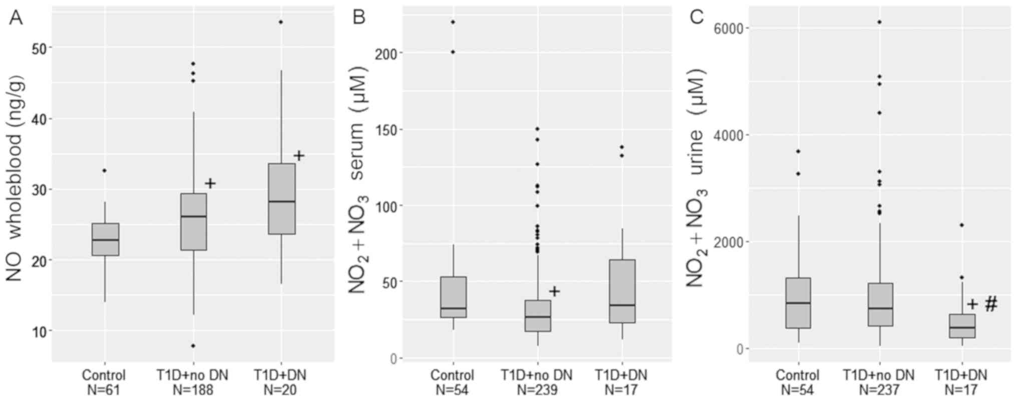 The present study aimed to assess the impact of T1D and diabetic nephropathy on the concentrations of NO in whole blood, and its metabolites NO2-+NO3- in serum and urine in patients with T1D.