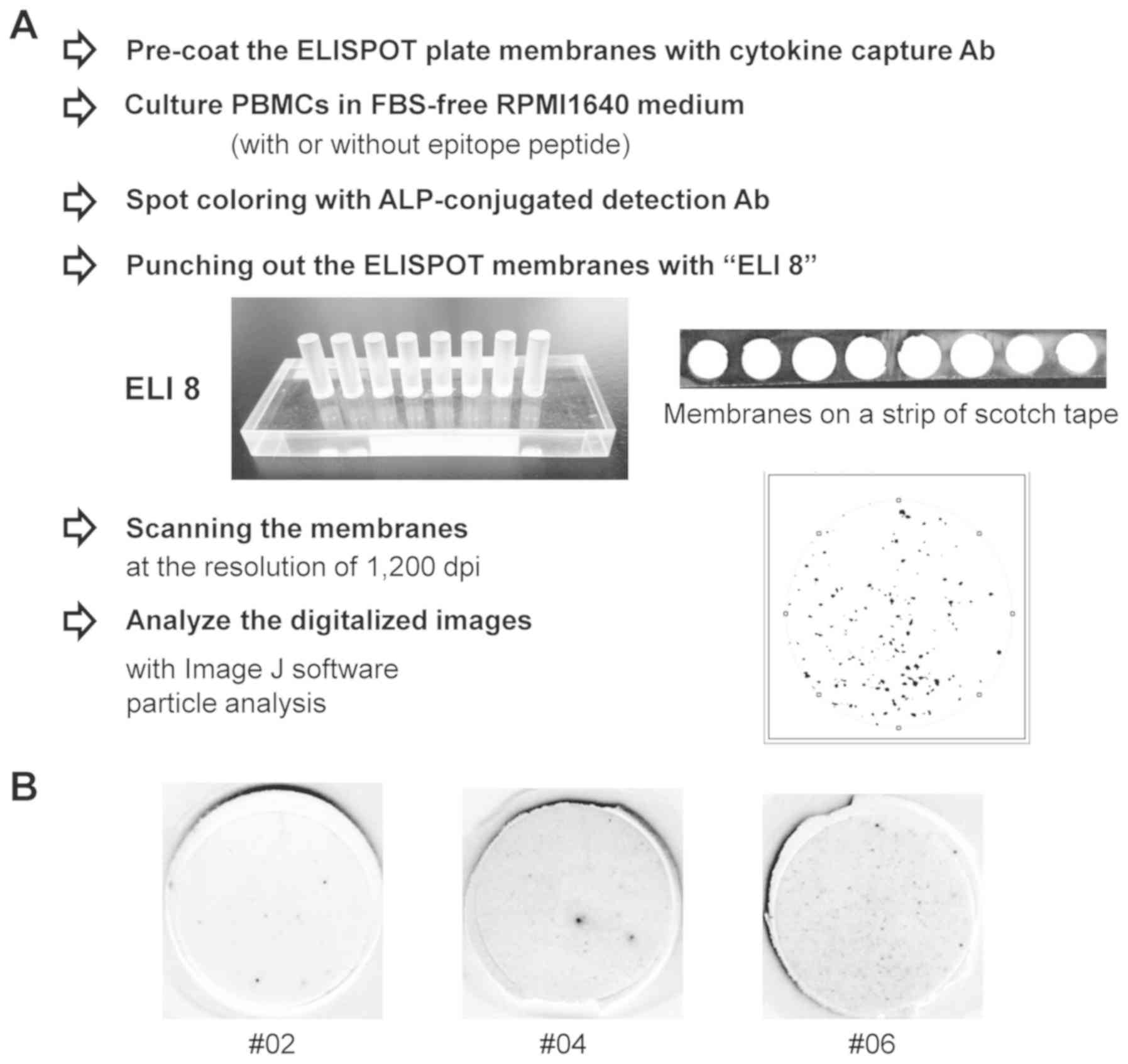 Following hydrophilization treatment with 35% ethanol for 1 min and three washes with PBS, a membrane of each well in a 96-well filtration plate (Merck KGaA) was incubated with capture antibodies, anti-human interferon-γ (IFN-γ) monoclonal antibody (cat. no. 3420-3-250; Mabtech AB; final concentration, 15 µg/ml in PBS) and anti-human tumor necrosis factor-α (TNF-α) monoclonal antibody (cat. no. 3510-3-250; Mabtech AB; final concentration, 7.5 µg/ml in PBS) at 4˚C overnight. Following four washes with PBS, the membrane was incubated with 200 µl 1X Blocking one (cat. no. 03953-95; Nacalai Tesque, Inc.) for 2 h and washed three times with PBS. Thawed PBMCs were suspended in FBS-free RPMI-1640 medium (Nacalai Tesque, Inc.) and 5x104 cells per 100 µl were seeded in each well in triplicate and incubated with 5% CO2 in a humidified atmosphere at 37˚C for 48 h. To stimulate PBMCs, an antigen peptide was added to each well at a final concentration of 10 µg/ml. Following removal of the cell suspension, each membrane was washed with 200 µl PBS containing 0.05% Tween-20 for 10 min and treated with 100 µl ACCUMAX™ (Sigma-Aldrich; Merck KGaA) at room temperature for 15 min with gentle agitation. After three washes with PBS containing 0.05% Tween-20, each membrane was incubated at 4˚C overnight with the corresponding detection antibodies in PBS containing 1% BSA and 0.05% Tween 20: Biotinylated anti-human IFN-γ monoclonal antibody (cat. no. 3420-6-250; Mabtech AB; final concentration, 3 µg/ml) and biotinylated-anti-human TNF-α monoclonal antibody (cat. no. 3510-6-250; Mabtech AB; final concentration, 1.5 µg/ml). Following four washes with PBS, each membrane was incubated with alkaline phosphatase-conjugated streptavidin (cat. no. 3310-8; Mabtech AB; diluted 1:500 with 0.05% Tween-20 in phosphate buffered saline without magnesium and calcium [PBS (-)]) at room temperature for 1 h. After washing both sides of the membranes with deionized water for 3 min, the spots were stained with BCIP/NBT solution (Nacalai Tesque, Inc.) for 3 min followed by washing with deionized water. Following drying at 4˚C overnight, a strip of clear adhesive tape was attached to the back of the membranes of 8 wells in a single row. The membranes were punched out with an acrylic device ELI 8 (Create Ltd.). The membranes were subsequently sandwiched a second strip of adhesive tape and scanned at the resolution of 1,200 dpi. The generated digital images were analyzed by spot counting using particle analysis by ImageJ 1.45 software (National Institutes of Health) (Fig. 1).