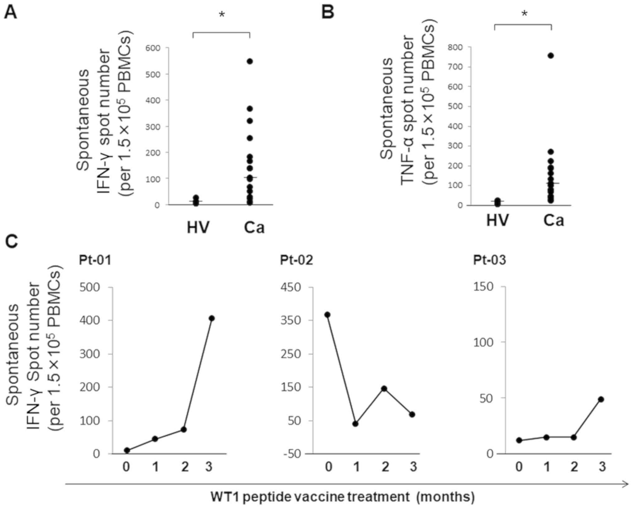 Peptides for the ELISPOT assay were synthesized by PH Japan. The amino acid sequences were as follows: WT1-235 peptide, CMTWNQMNL; WT1-126 peptide, RMFPNAPYL.