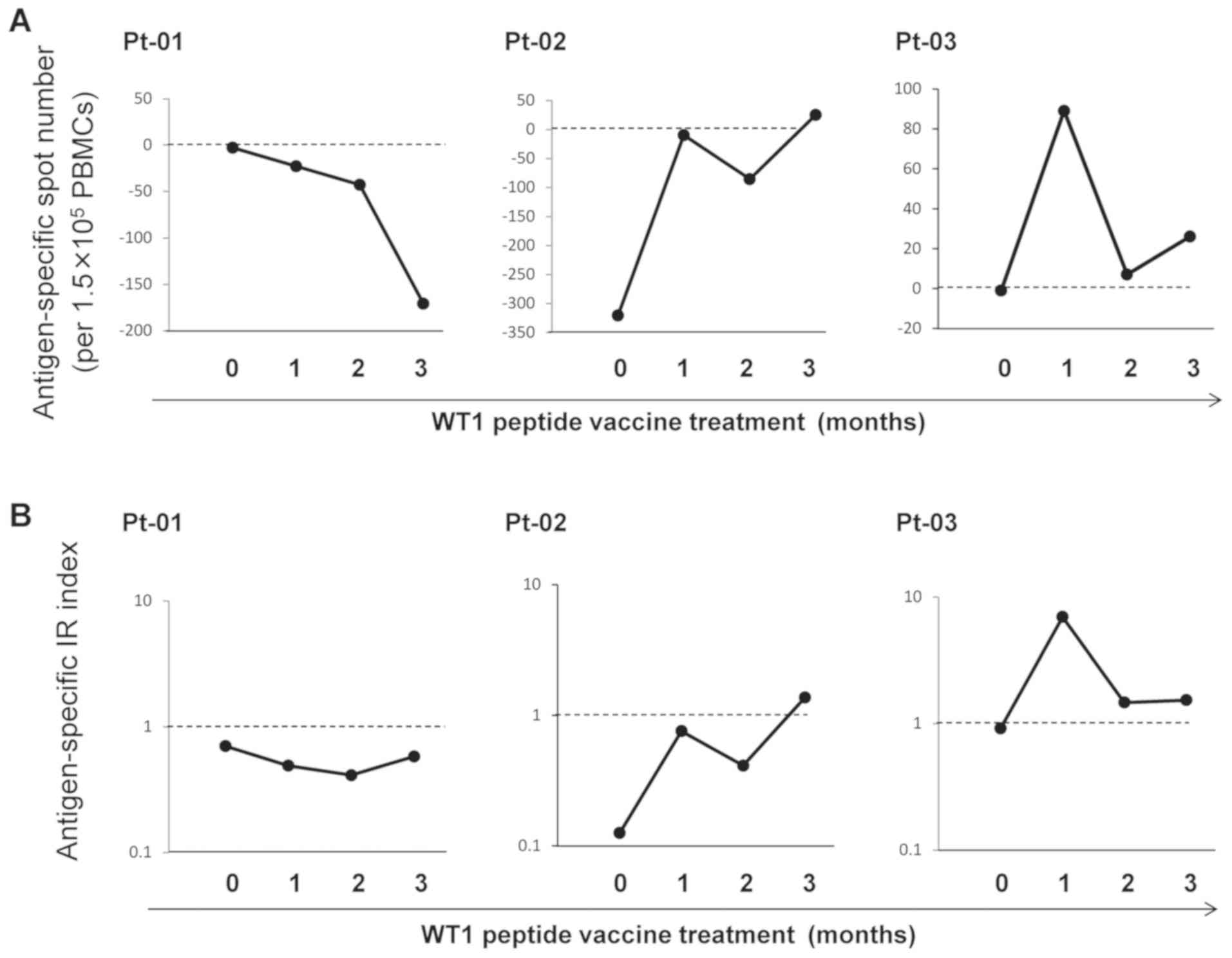 Secretion of IFN-γ by PBMCs was analyzed by ELISPOT assay in three patients with cancer at the indicated time points during three months of WT1 peptide vaccine cancer immunotherapy. WT1-235 and WT1-126 peptides were used for antigen-stimulation of HLA-A*24:02 patients (Pt-01 and Pt-03) and HLA-A*02:01 patient (Pt-02), respectively. First, WT1 antigen-specific IFN-γ secretion by PBMCs was described as antigen-specific spot number: (Number of SFCs in antigen-stimulated test conditions)-(number of SFCs in antigen-free control conditions) (Fig. 3). As presented in Fig. 3A, masked by the number of spontaneous cytokine-producing cells, antigen-specific IFN-γ-secreting spot numbers became negative at multiple time points. In addition, the number of SFCs provided no information about the frequency of antigen-specific cytokine-secreting cells in the total pool of cytokine-producing cells. Therefore, when the number of antigen-specific SFCs increased after vaccine immunotherapy, it remained unclear whether this increase was due to antigen-non-specific effects or the induction of antigen-specific cellular immune responses. Therefore, WT1 antigen-specific IFN-γ secretion by PBMCs was also described as antigen-specific IR index: (Number of SFCs in antigen-stimulated test conditions)/(number of SFCs in antigen-free, control conditions). With this index, the direction of the cellular immune responses to the targeted antigen WT1 was successfully detected (Fig. 3B).