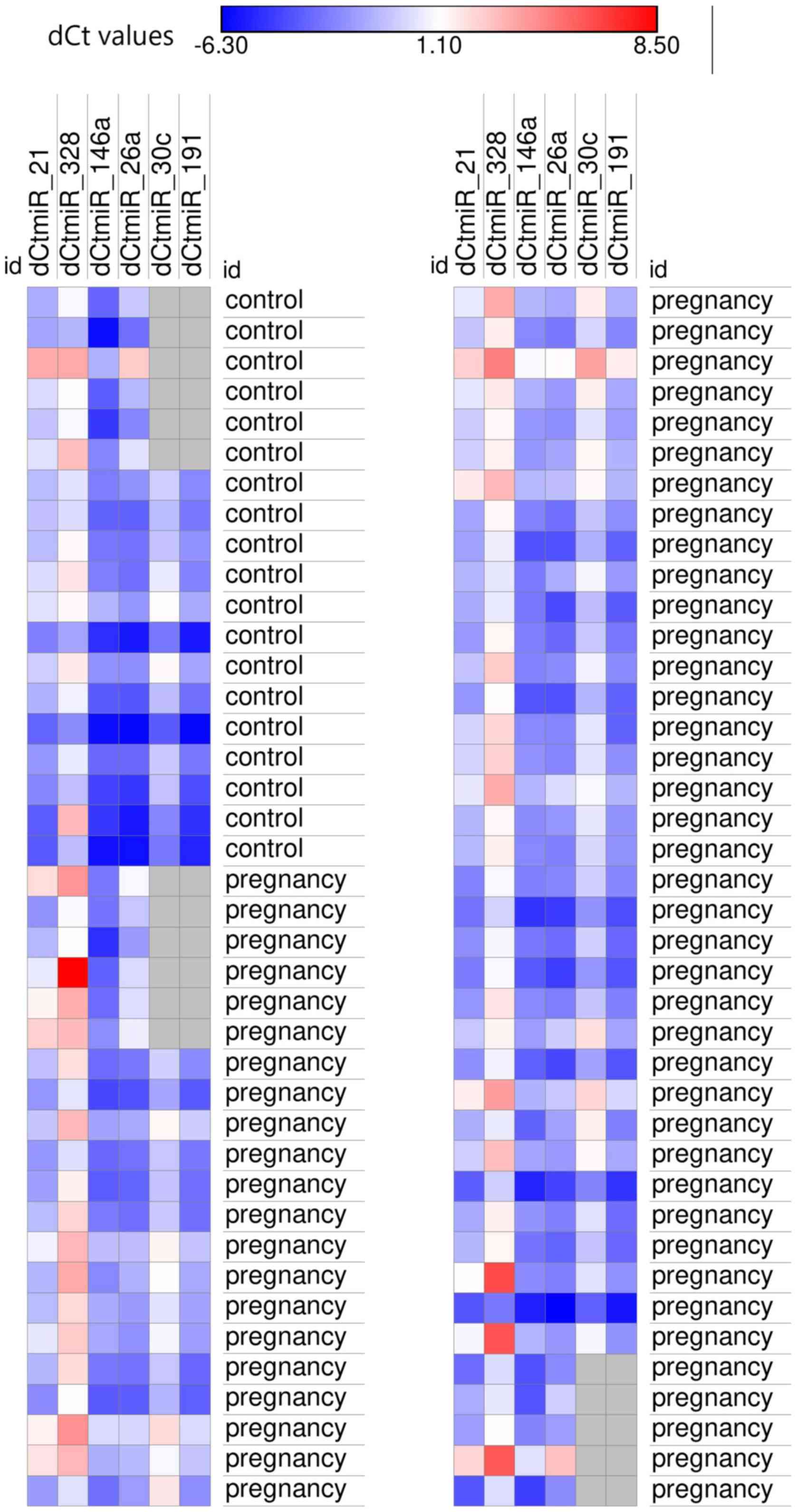 All pregnant women expressed miRNAs associated with cardiac hypertrophy and fibrosis (miR-21, miR-26a, miR-30c, miR-146a and miR-191). Additionally, the other miRNAs from this group, miR-15b (58/61, 95%), mir-29a (57/61, 93%), miR-29c (60/61, 98%), miR-101 (40/61, 66%) and miR-328 (58/61, 95%), were found to be expressed in a considerable proportion of pregnant women. In contrast, none of the study participants expressed miR-208a.