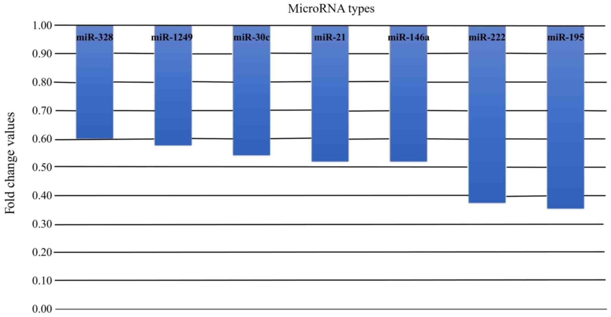Expression of miRNAs was analyzed using Custom TaqMan Array miRNA Cards (Applied Biosystems; Thermo Fisher Scientific, Inc.). First, selected miRNAs were used to synthesize cDNA using TaqMan MicroRNA Reverse Transcription kit (Applied Biosystems; Thermo Fisher Scientific, Inc.). Briefly, 6 ng isolated RNA in a final volume of 3 µl was added to the reverse transcription (RT) reaction mix consisting of 6 µl custom RT primer pool, 0.3 µl dNTPs with dTTP (100 mM), 3 µl MultiScribe Reverse Transcriptase (50 U/µl), 1.5 µl 10x RT buffer, 0.19 µl RNase inhibitor (20 U/µl) (Applied Biosystems; Thermo Fisher Scientific, Inc) and 1.01 µl nuclease-free water (Ambion; Thermo Fisher Scientific, Inc.). cDNA was synthesized according to the manufacturer's protocol (Applied Biosystems; Thermo Fisher Scientific, Inc). Subsequently, the preamplification reaction was performed using TaqMan PreAmp Master mix and 2X custom PreAmp primer pool (Applied Biosystems; Thermo Fisher Scientific, Inc.), according to the manufacturer's protocol. Briefly, 22.5 µl of the reaction mix was added to 2.5 µl of each product from the reverse transcription, and then, the reaction was amplified using thermocycling conditions specified in the manufacturer's protocol (Applied Biosystems; Thermo Fisher Scientific, Inc). After the reaction was complete, each PreAmp product was diluted 8-fold with 0.1X TE buffer (pH 8.0) (Ambion; Thermo Fisher Scientific, Inc.) to a final volume of 200 µl. To prepare the qPCR reaction mix, 1.13 µl diluted PreAmp product was added to the reaction mix consisting of 56.25 µl TaqMan Universal MasterMix II, No AmpErase UNG (2X) (Applied Biosystems; Thermo Fisher Scientific, Inc.) and 55.12 µl nuclease-free water (Ambion; Thermo Fisher Scientific, Inc.), and mixed. Subsequently, 100 µl of the complete qPCR reaction mix was loaded into a single port on the TaqMan Array miRNA card, centrifuged (2x1 min, 331 x g at 25˚C) and mechanically sealed. Each qPCR reaction was performed in triplicate using a ViiA7 Real-Time PCR system using thermocycling conditions specified by the manufacturer (Applied Biosystems; Thermo Fisher Scientific, Inc.). The Cq cut-off for the detection was 40 cycles. The results of qPCR were analyzed using automatic baseline and manual threshold set at 0.2 for all samples. U6 small nuclear RNA was used as the endogenous control. Relative expression of analyzed miRNAs was calculated using the 2-ΔΔCq method (14). The expression levels of the following 24 miRNAs were analyzed: miR-1 (assay ID 000385), miR-15b (assay ID 000390), miR-17-5 (assay ID 000393), miR-21 (assay ID 000397), miR-22 (assay ID 002301), miR-26a (assay ID 000404), miR-27b (assay ID 000409), miR-29-a (assay ID 002112), miR-29c (assay ID 000415), miR-30c (assay ID 00419), miR-34a (assay ID 000425), miR-101 (assay ID 002253), miR-124 (assay ID 001182), miR-133a (assay ID 000458), miR-146a (assay ID 000468), miR-191 (assay ID 002299), miR-195 (assay ID 000494), miR-199a-3p (assay ID 002304), miR-199b (assay ID 000500), miR-208a-5p (assay ID 462036_mat), miR-210 (assay ID 000512), miR-222 (Assay ID 000525), miR-328 (assay ID 00543) and miR-1249 (assay ID 002868). Assay ID numbers refer to the catalogue numbers of TaqMan Real-time PCR assays (Thermo Fisher Scientific Inc.).