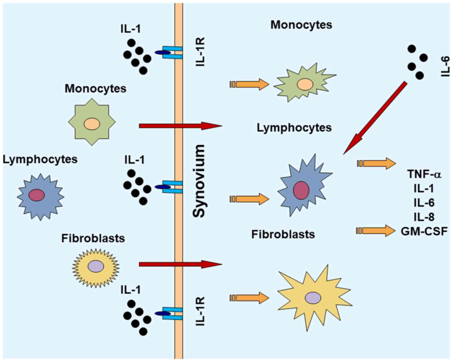 IL-1 is an important inflammatory factor that is involved in the pathogenesis of RA. IL-1 induces an inflammatory response and activates or increases the expression of other pro-inflammatory mediators that promote damage to the joints (18). In the synovial membrane, IL-1 and IL-1 receptor antagonists are abundantly expressed (18). IL-1 activation causes migration of inflammatory cells to the joints and the synovium in patients with RA. Then, macrophages, lymphocytes, monocytes and transformed fibroblasts are triggered to produce increased quantities of IL-1, which contributes to the production and secretion of various cellular messengers (19). Regulatory agents, such as proteoglycans and proteases contribute to the formation and accumulation of pannus in the joints, resulting in the erosion of the cartilage and bone, fibrosis, and ultimately articular function loss (20). At the cellular level, there are several other cytokines induced by IL-1, including TNF-α and IL-6(18). As the key pro-inflammatory cytokines in RA, IL-1 and TNF-α act synergistically in promoting further inflammation and matrix damage to the arthritic joints (21). In an experimental animal model, IL-1 was shown to stimulate cartilage and bone re-absorption and inhibit articular collagen and proteoglycan synthesis (22). Experiments performed on RA animal models suggest that IL-1 serves a crucial role in the degradation of proteoglycans and thus increases joint damage (22,23). Local production of IL-1 was shown to inhibit proteoglycan synthesis in the knee joints of a collagen-induced arthritis (CIA) model (24). In addition, IL-6 in synovial cells can lead to the acceleration of joint breakdown by attracting and retaining large quantities of leukocytes in the inflamed synovium (25). In patients with RA, there are increased levels of IL-1 in the plasma and synovial fluid (26,27). The IL-1 family includes IL-1α and IL-1 and IL1 receptor antagonist (IL-1Ra). The biological activation of cells by IL-1 requires the expression of the type I IL-1 receptor (IL-1R). The receptor antagonist IL-1Ra, generated by certain cells in the joint, can competitively bind with IL-1R. As an anti-inflammatory protein that binds to IL-1R without transducing signals, IL-1Ra may, to some extent, regulate the activity of IL-1(18). It has been reported that IL-1Ra-deficient mice develop spontaneous arthritis, mediated through the amplification of Th17-dependent inflammation (28). IL-1Ra effectively attenuated joint destruction in an experimental RA model (29). There is a dysregulation of IL-1Ra production and inhibition of the effects of IL-1β in RA patients (30). IL-18, another member of the IL-1 cytokine superfamily, is widely detected in the synovium of patients with RA (18). The mRNA expression levels of IL-18 and IL-1β are differentially regulated. It has been found that IL-18 distributes in the synovial membrane with a different pattern compared with IL-1β. While IL-1β is localized primarily throughout the interstitium, lining layer and vasculature, IL-18 is highly expressed in lymphocytic aggregates (31). The expression of IL-18 in synovial tissues in vitro is associated with increased TNF-α and IL-1β, and the blockade of IL-18 by a neutralizing antibody was shown to ameliorate the disease in rodent RA models (32). IL-18 also contributes to cartilage degradation by affecting cell proliferation and the expression of matrix metalloproteinase and inducible NO synthase gene expression (33).