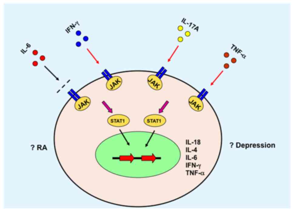 Interestingly, a recent study found that the antidepressant venlafaxine could ameliorate arthritis by targeting STAT3 and IL17(84). Clinical data has validated that IFN-γ levels are well correlated with clinical symptoms of depression in patients with glioma (85). Although there is no effort to explore whether IFN-γ activated the STAT cascade in depression, data have shown that IFN-α can activate JNK/STATs in a model of depression (86).