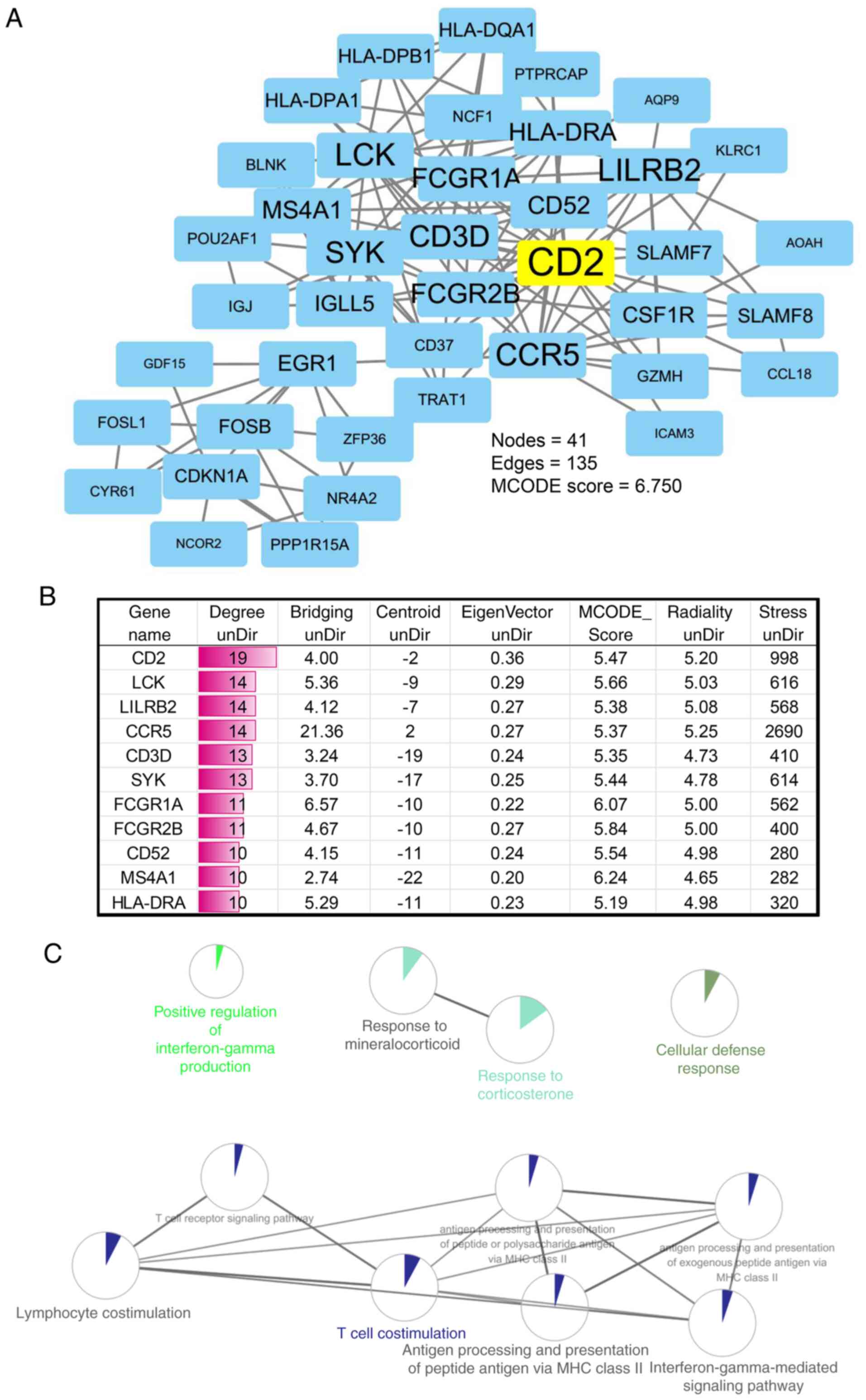 The key nodes in the PPI network were analyzed using Cytoscape plugins, to further analyze the hub genes in RA and determine the association of the protein interactions. The results showed that the interactive network had 41 nodes, 135 edges and a MCODE score of 6.750 (Fig. 3A). The degree of each node gene was further calculated, and CD2 had the highest topological connectivity (Fig. 3B). Furthermore, the Clue-GO plugin in Cytoscape software was used to enrich and annotate the key PPI module genes. Results showed that the key module genes were enriched primarily in response to corticosterone, antigen processing, and presentation of peptide or polysaccharide antigen via MHC class II, lymphocyte co-stimulation, interferon-γ-mediated signaling pathway, T cell co-stimulation and the T cell receptor signaling pathway (Fig. 3C).