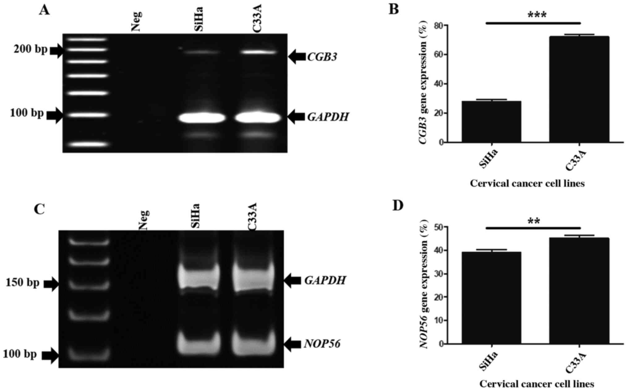 To assess the expression of CGB3 and NOP56 genes, PCR was performed in SiHa (HPV+) and C33A (HPV-) cancer cell lines. The results showed that both CGB3 and NOP56 exhibited lower expression in SiHa cells (26.74 and 38.42%, respectively) compared with that observed in C33A cells (73.26 and 44.5%), respectively (Fig. 3A and C). GAPDH was used for CGB3 gene and GAPDH1 primer was used for NOP56 gene normalization in SiHa and C33A cells. The bar graphs shows the mean ± standard error of the mean of CGB3 (P=0.001; Fig. 3B) and NOP56 expression (P=0.004; Fig. 3D).