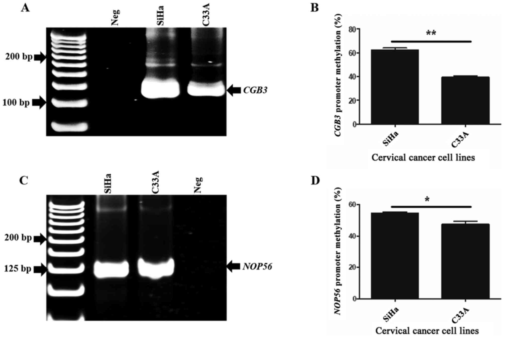 Furthermore, methylation status was also observed for both the genes, and compared between SiHa and C33A cells. The results demonstrated that the methylation of CGB3 and NOP56 (primer II) in SiHa cells was 61.18 and 53.94% compared with C33A cells (38.81 and 46.05%), respectively (Fig. 4A and C). The bar graph shows the mean ± standard error of the mean of CGB3 (P=0.004; Fig. 3B) and NOP56 methylation (P=0.045; Fig. 3D). The results indicated that the presence of HPV may influence the expression and methylation of CGB3 and NOP56 genes.