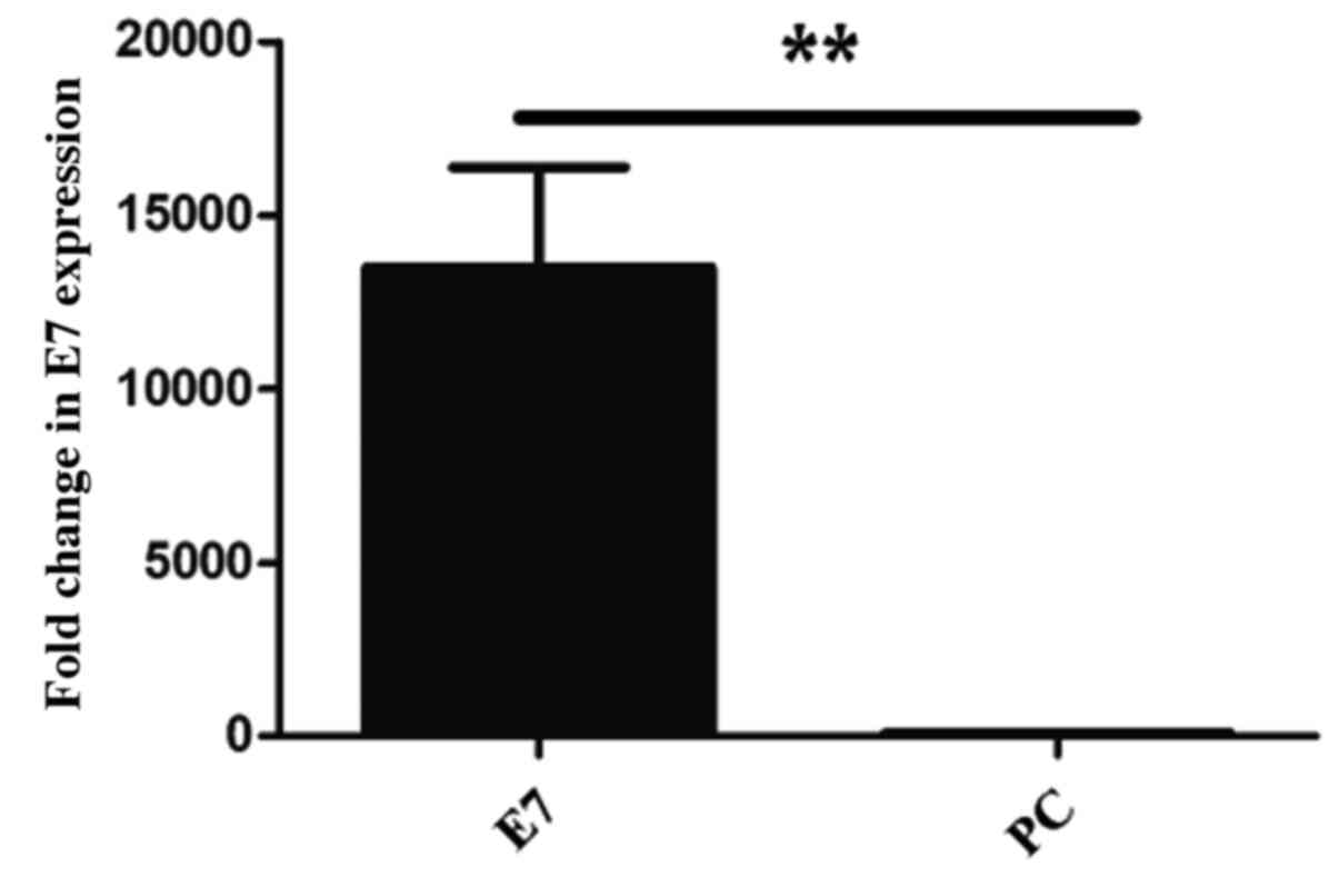 To assess whether HPV E7 induced gene promoter methylation and thus decreased expression, HPV 16 E7 was overexpressed in C33A (HPV-) cells. The results demonstrated that the expression of HPV 16 E7 was significantly higher in HPV 16 E7 transfected cells (P=0.001) compared with the PC transfected cells (Fig. 5).