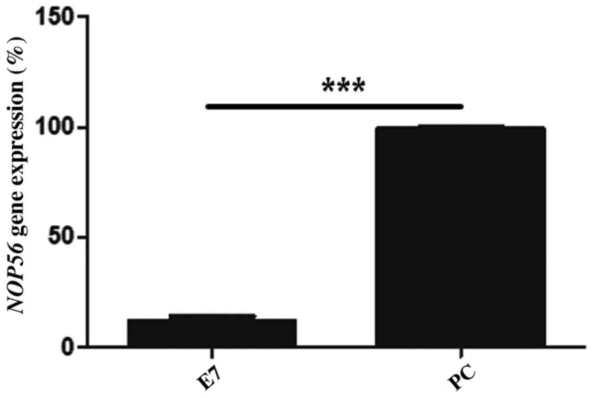 Furthermore, alterations to gene promoter methylation and expression were assessed in HPV 16 E7 transfected C33A cells. At 72 h post-transfection, the band intensities of CGB3 and NOP56 were compared between E7- and PC-transfected cells. To measure gene expression and methylation, reverse transcription-PCR and MS-PCR were performed, respectively. The gene expression levels of CGB3 were significantly reduced (P=0.02) in HPV 16 E7 transfected cells (band intensity, 37.2%) compared with that in the PC transfected cells (band intensity, 62.7%) (Fig. 6A). The bar graph shows the mean ± standard error of CGB3 expression (Fig. 6B). NOP56 expression level in HPV 16 E7 transfected C33A cells was significantly decreased (P<0.0001) compared with that in the PC transfected cells (Fig. 7). GAPDH was used as an internal control. The expression of NOP56 was measured by qPCR.