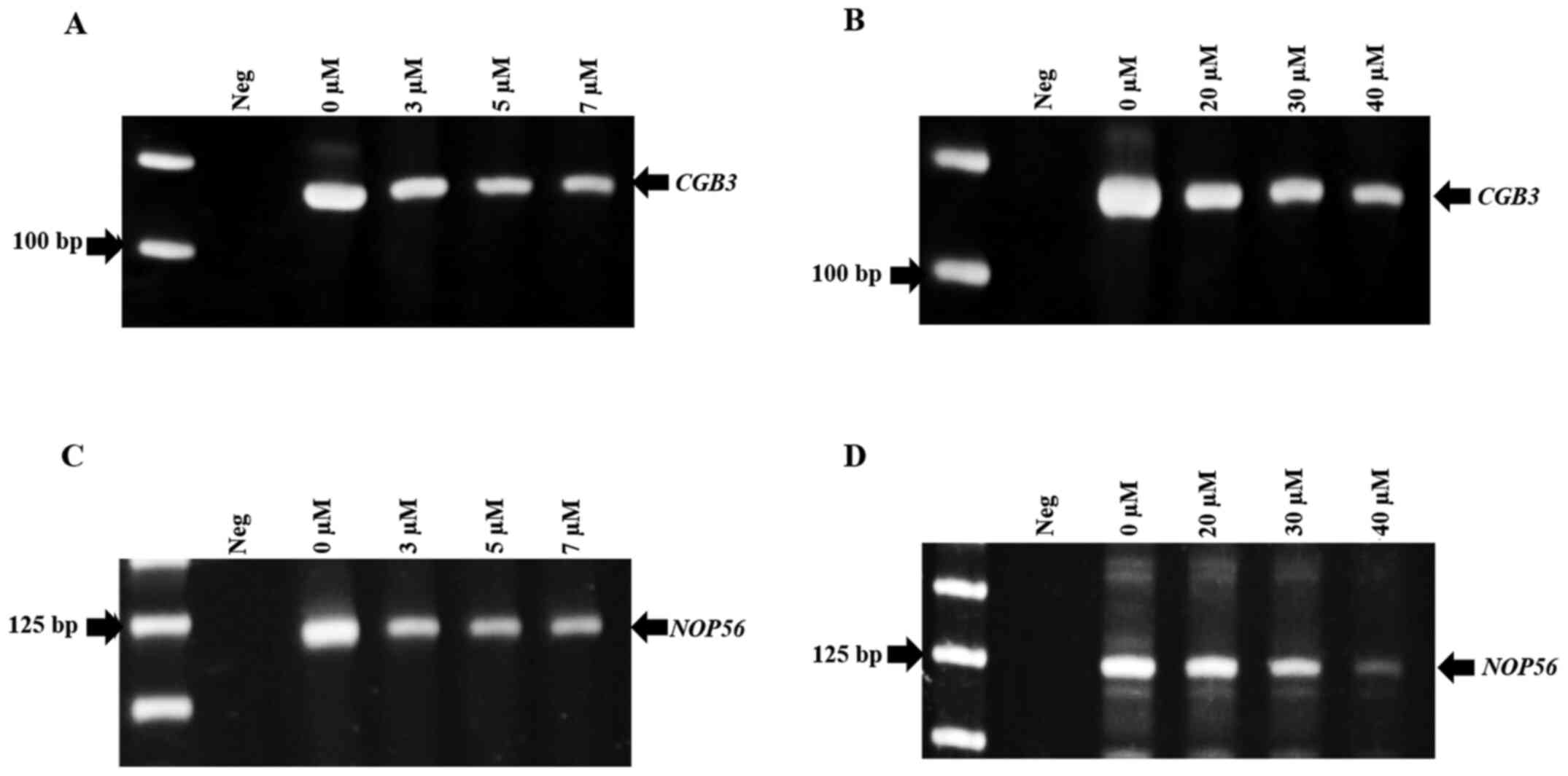 5-aza interferes with DNA methylation and can be used to reactivate silenced genes in cancer (31-34). Examples of genes reactivated following 5-aza treatment include CD44, GSTP-1, BRCA1, MDR1, MUC2 and GPC3, which possess hypermethylated promoter CpG islands in tumors (31). Wong et al (48) showed that methylation-mediated silencing of gene expression can be reversed by treatment with the demethylating agent 5-aza. Reactivation of methylation-silenced genes indicates that the gene is functional, and that DNA methylation regulates its transcription (39,40). With regard to the present study, it was necessary to treat SiHa cells with higher concentrations of 5-aza compared with the C33A cells, as SiHa is a HPV positive cancer cell line, meaning that promoter methylation was more prominent in them. Therefore, the lower concentration of 5-aza may not overcome HPV-induced methylation in SiHa cells. Following treatment with 5-aza at higher concentrations of 20, 30 and 40 µM in SiHa cells, and at lower concentrations of 3, 5, and 7 µM in C33A cells for 5 days, it was found that the methylation levels of CGB3 and NOP56 were decreased leading to increased expression of both genes. At 40 µM, the re-expression of CGB3 and NOP56 genes was observed.