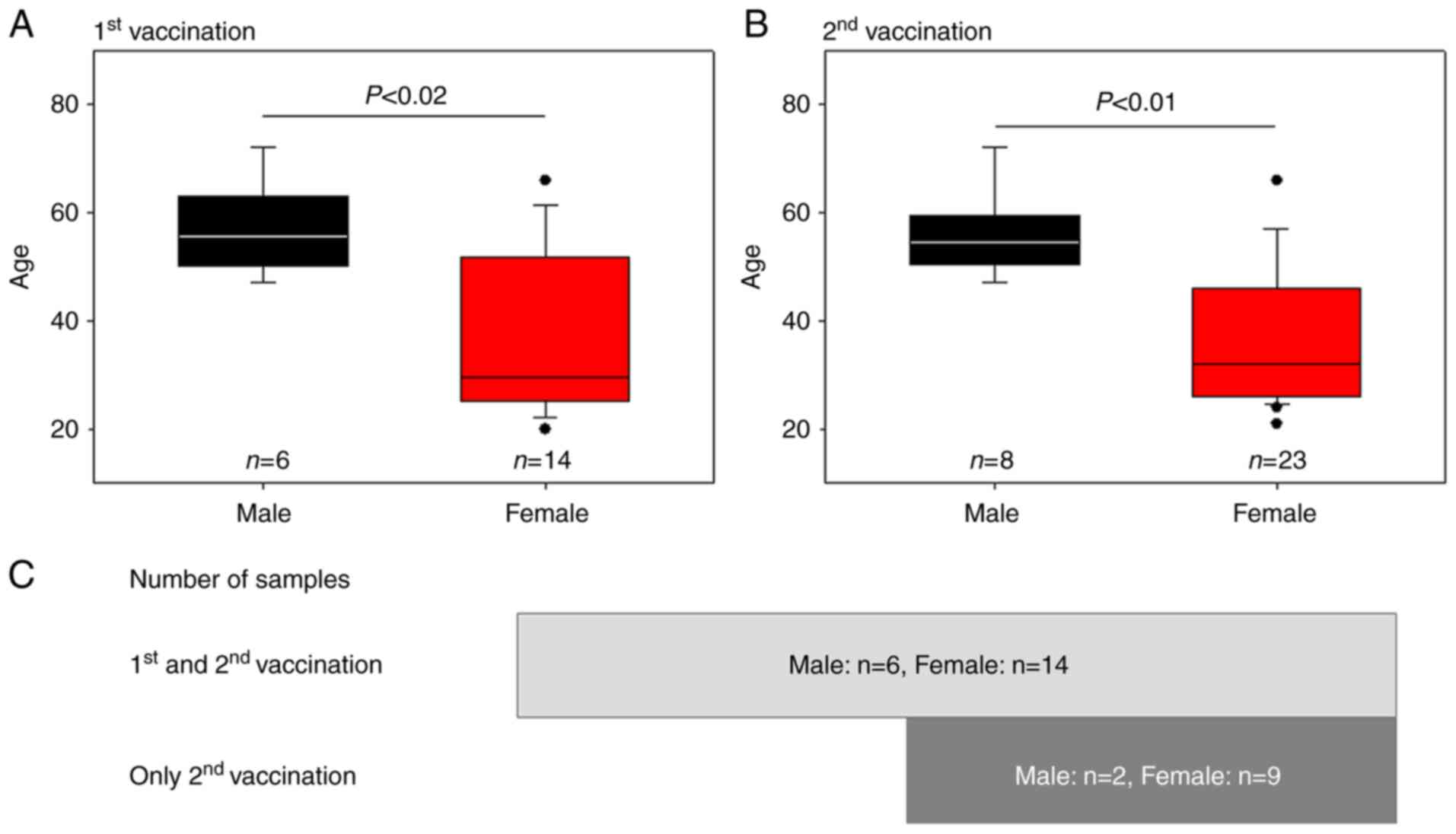 Healthy Japanese subjects (male: first vaccination, n=6, median age, 55.5, age range, 47-60); second vaccination, n=8, median age, 55.0, age range, 47-72; and female: first vaccination, n=14, median age, 29.5, age range, 20-57; second vaccination, n=23, median age, 32.0, age range, 21-66), who were selected from medical workers that were not receiving continuous medical treatment and would be receiving the Pfizer/BioNTech vaccine (BNT162b2) participated in this study. As for the inclusion criteria, the subjects were required to have no limitations on their activities of daily living, regardless of lifestyle-related diseases or regular medication. Subjects who had cancer or received estrogen replacement therapy were excluded. All subjects were required to declare that they were free of human immunodeficiency virus, hepatitis B virus, hepatitis C virus, or syphilis infections; any subjects who had been infected with any of these viruses were excluded from the study. No acute reactions were observed in the subjects during or immediately after blood samples were taken.