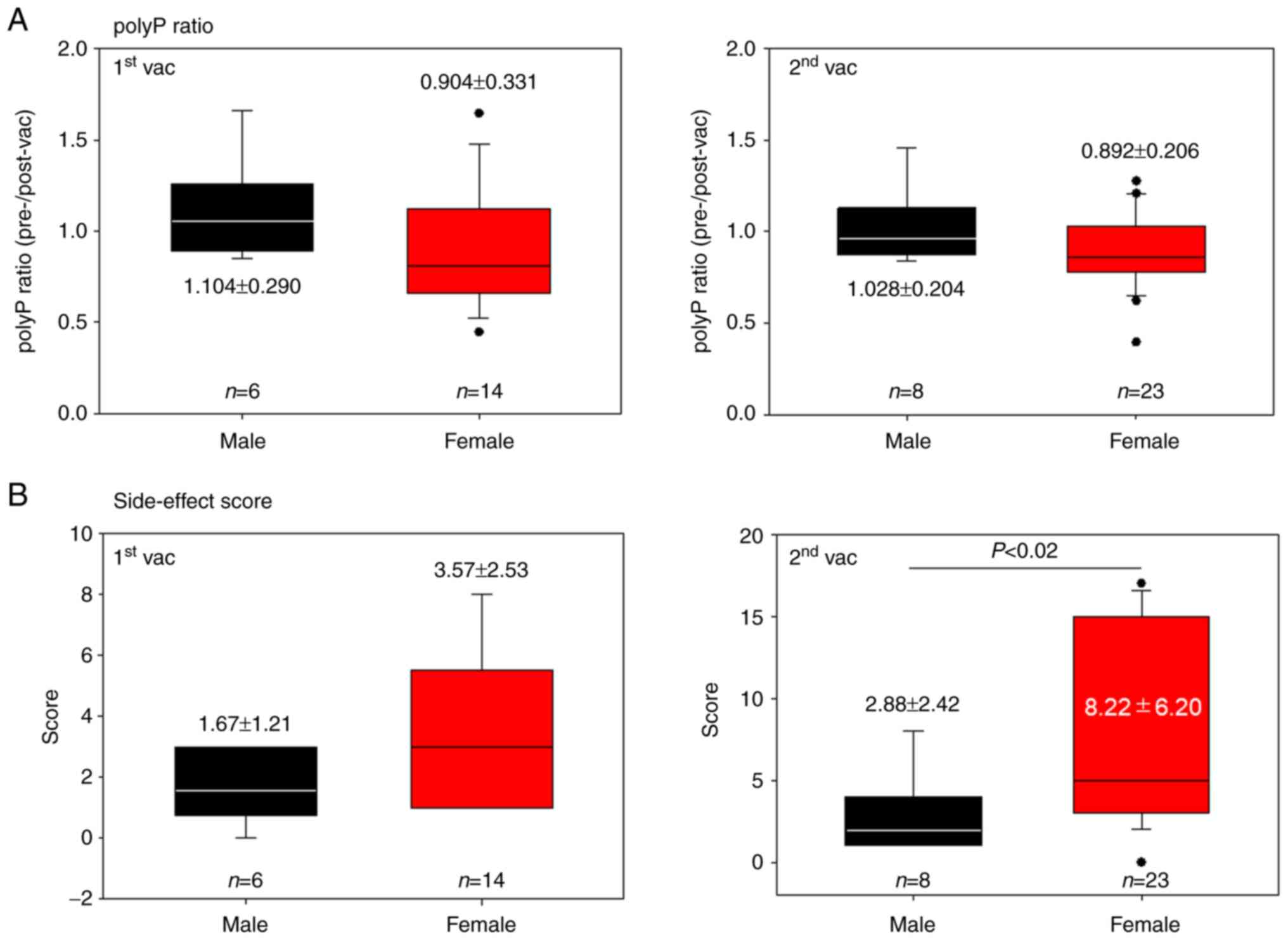 Quantification was performed in triplicate. Data are presented as the mean ± standard deviation. Data plotted in box plots represent the median values, the upper and lower quartiles (box), and maximum and minimum values (whiskers). A Mann-Whitney U test was performed to compare the two groups (SigmaPlot version 13.0; Systat Software, Inc.). To confirm the statistical difference provided by the Mann-Whitney U test, particularly given the fact that the score values were not continuous variables, data for the apparent reduction of platelet polyP levels (<0.9) and the apparent side-effect scores (>8.2) in individual data were also analyzed using a Fisher's exact test. These border values were derived from the mean values of the female group's polyP ratio post-first vaccination (0.9%) and the female group's score post-second vaccination (8.2). P<0.05 was considered to indicate a statistically significant difference.